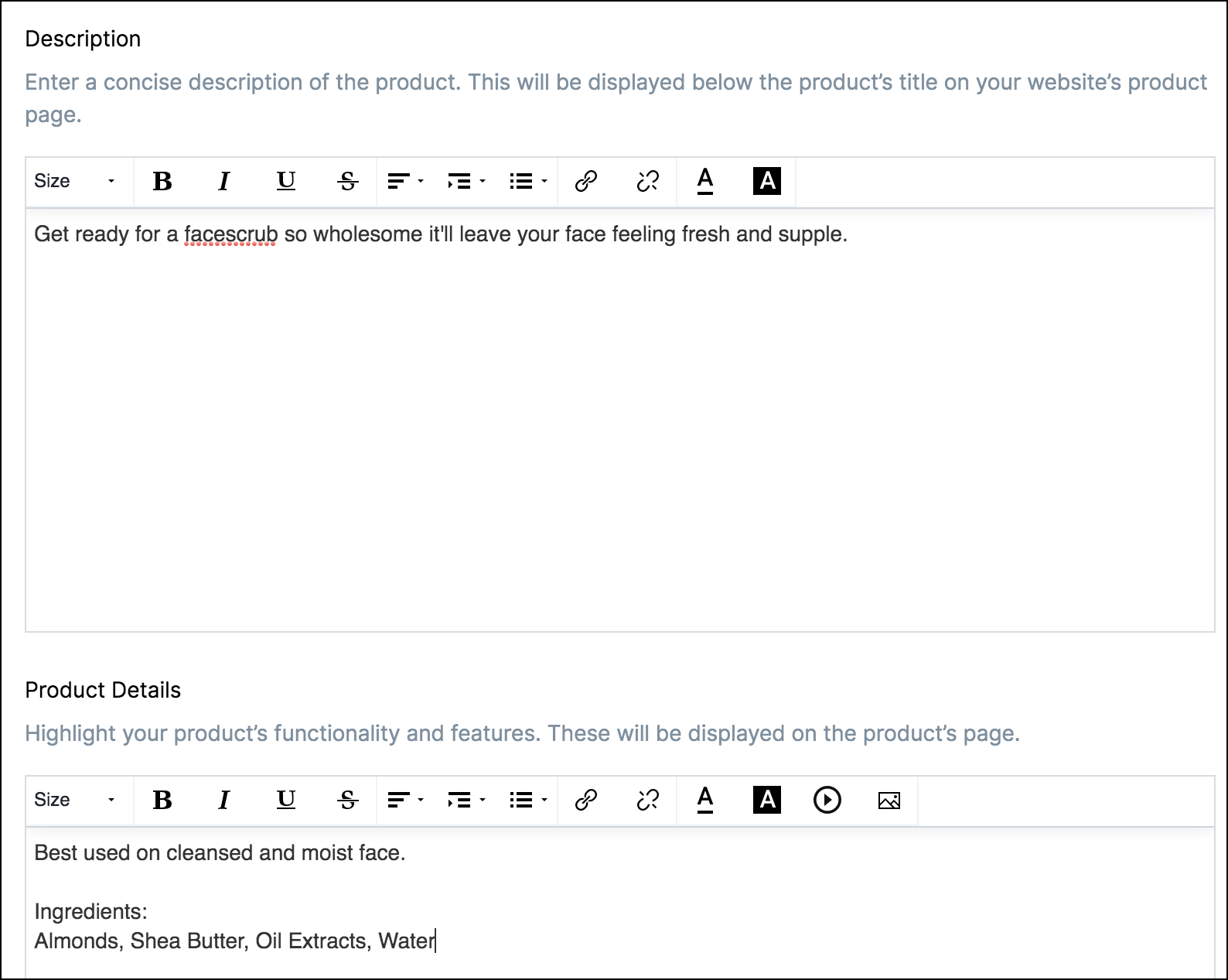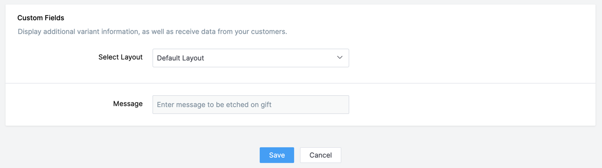 You can collect custom inputs from your customers or provide specific information about a product to your customers using this field. To know all about setting up custom fields,