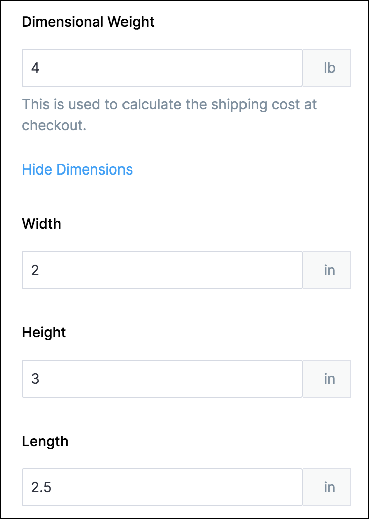 These values will be used to calculate the product's shipping costs. Enter your product's dimensions for automated shipping charge calculation.