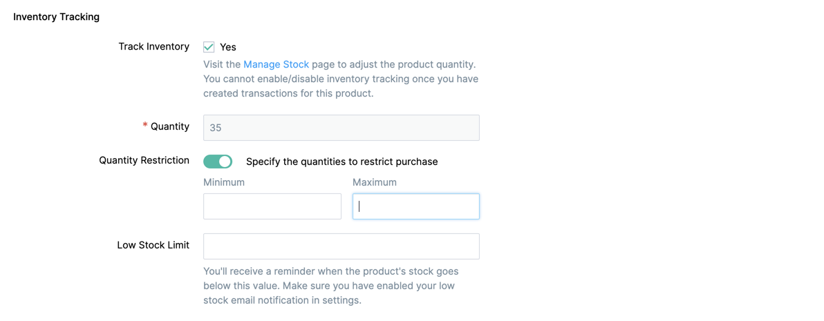 - To track the product's inventory, enter the quantity from Manage Stock and then enter its low stock limit as shown above.
