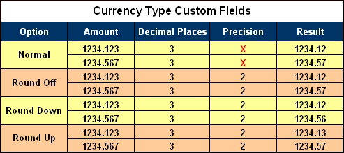 The currency field allows you to define the decimal and the precision settings based on your selected currency locale. There are four rounding options available for a currency field as displayed in the chart below: