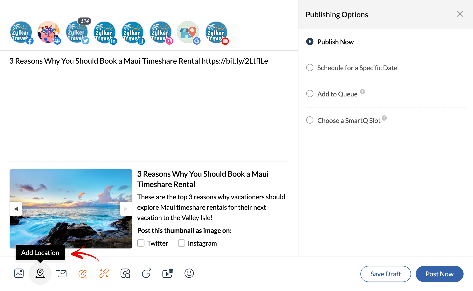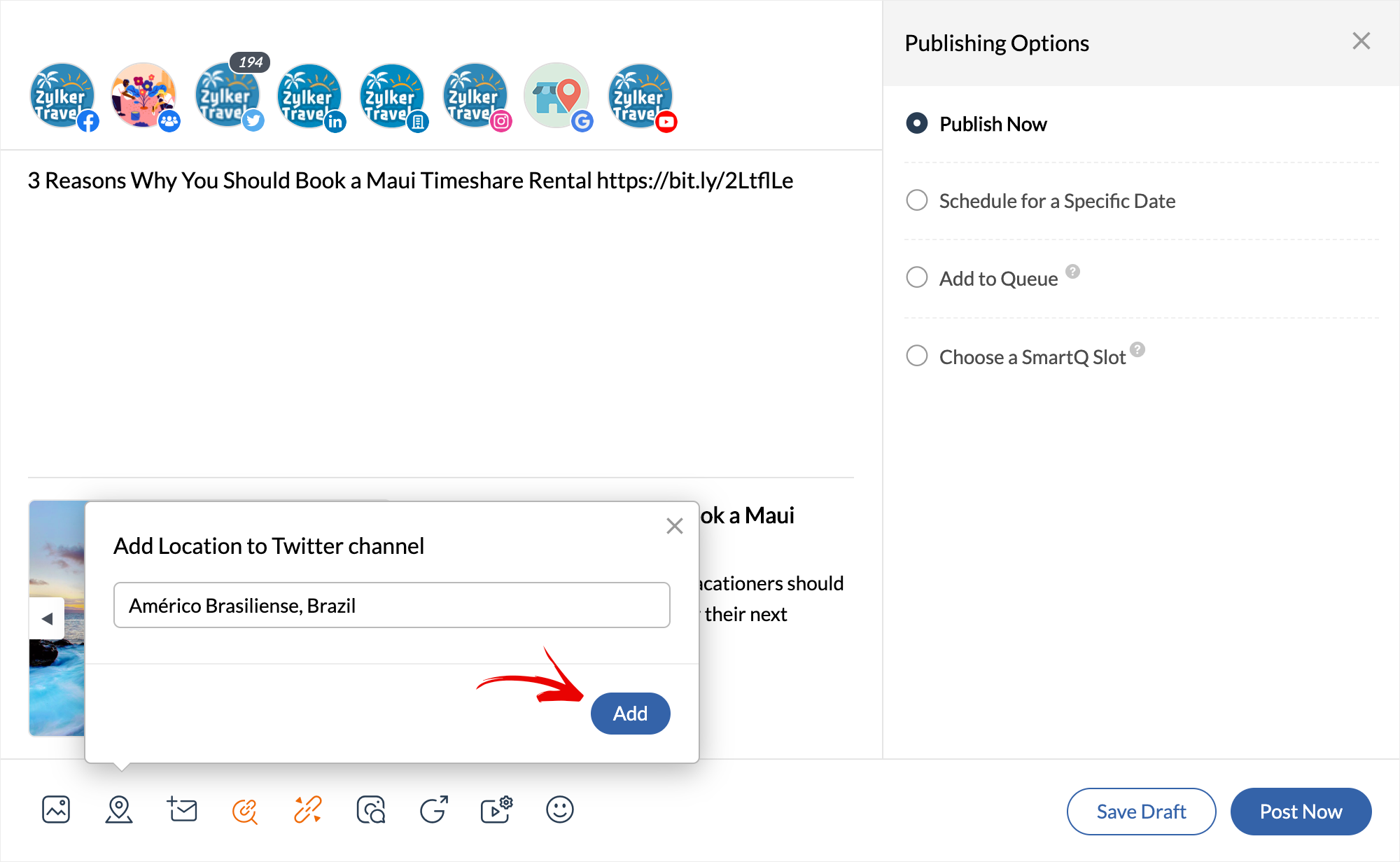 You can add your store or business location to Twitter posts easily from Zoho Social. Here how: