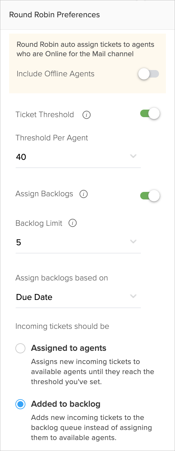- By default, tickets get assigned to agents who are Online for the Mail channel. However, you can choose to include Offline agents under Round Robin Preferences.