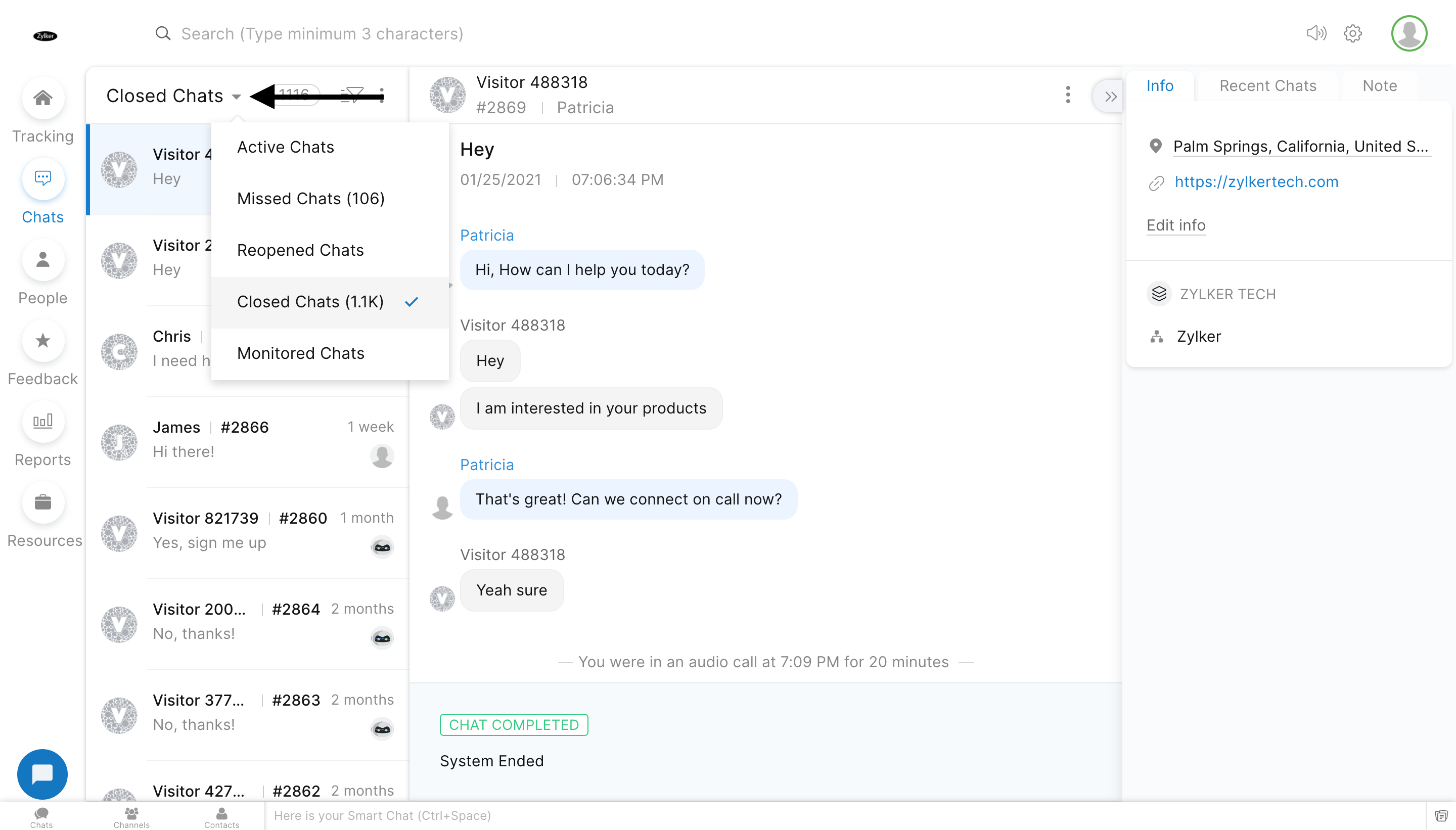 Chats module, you can see the active chats that are handled by you. When you are engaged in more than one chat at the same time, the chat window neatly organizes your active chats into tabs. You can also engage your customers in live chats and view visitor's in-depth info, add notes for future reference and download or mail the chat transcript, etc.