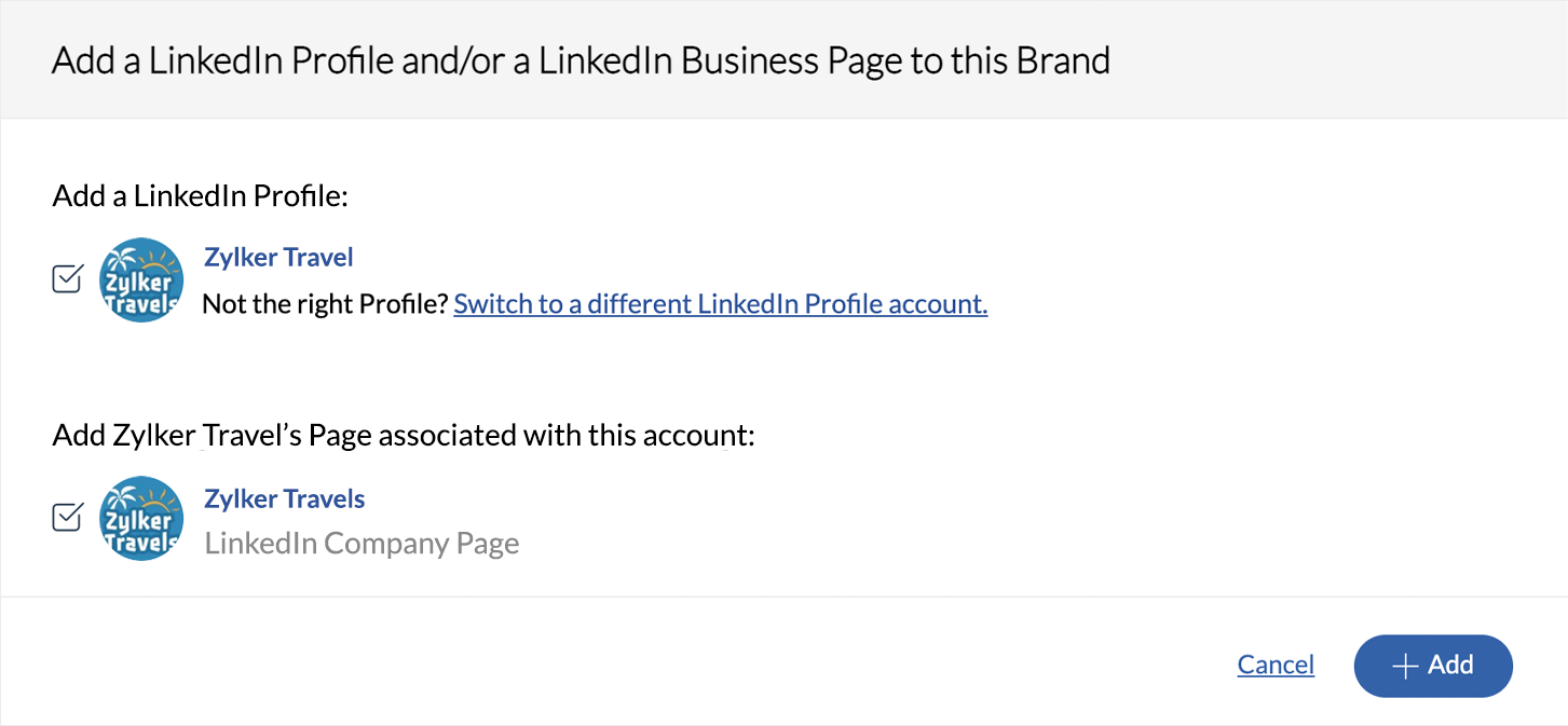 You can only add one LinkedIn Page and one Profile to each Brand on Zoho Social. Learn more about adding multiple Brands if you need to manage more than one LinkedIn Page and Profile.