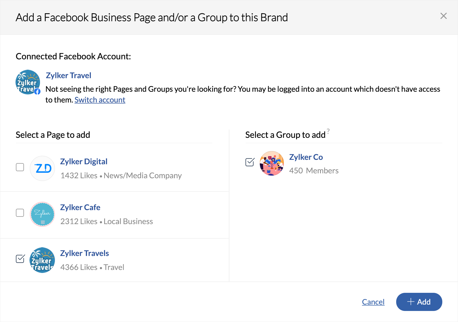 You can manage a single Facebook Page with one Brand on Zoho Social. Learn more about adding multiple Brands if you need to manage more than one Facebook Page.
