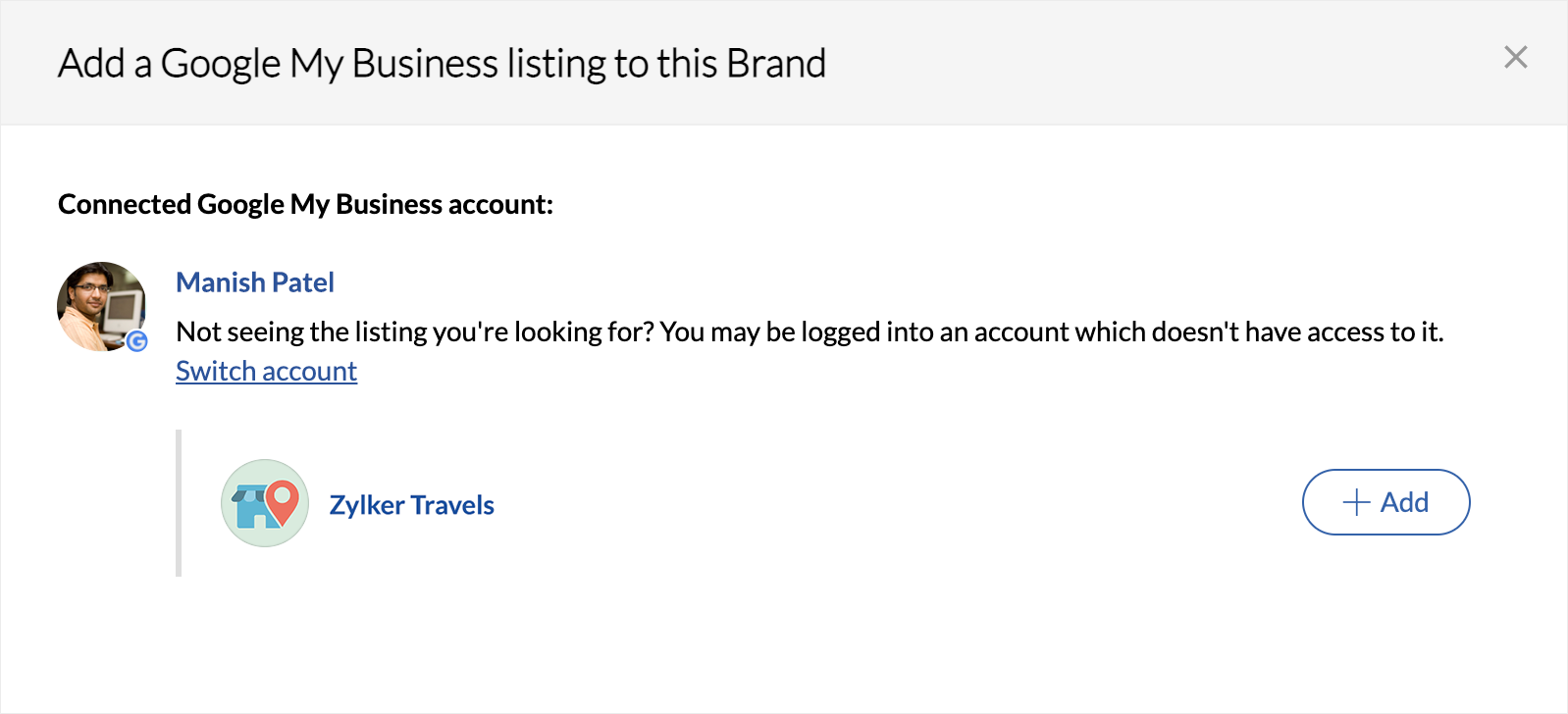 4. Click on +Add to connect a verified Google My Business listing to Zoho Social.