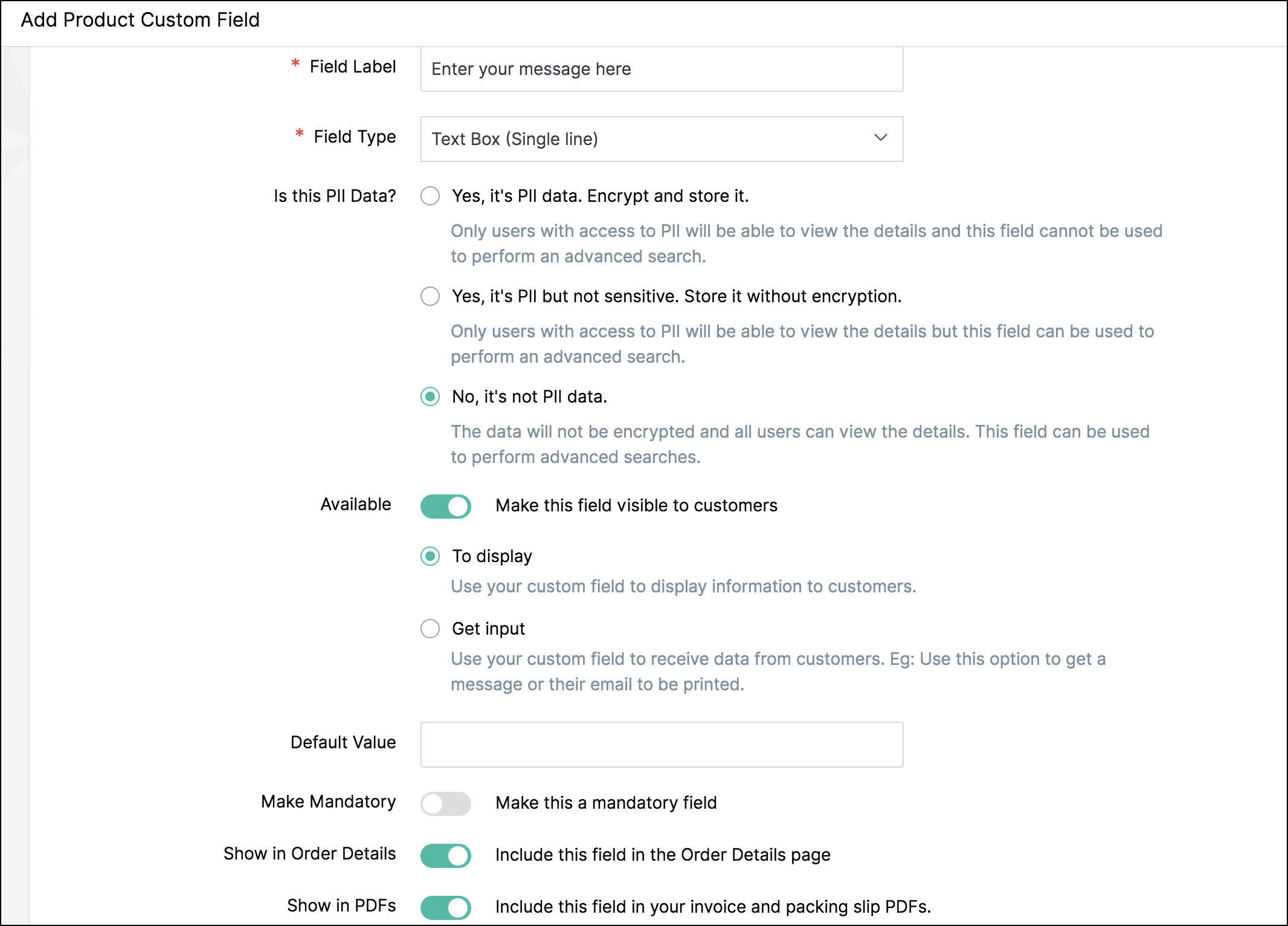Enable Show in PDF toggle to include this custom field in invoices and packaging slip PDF.
