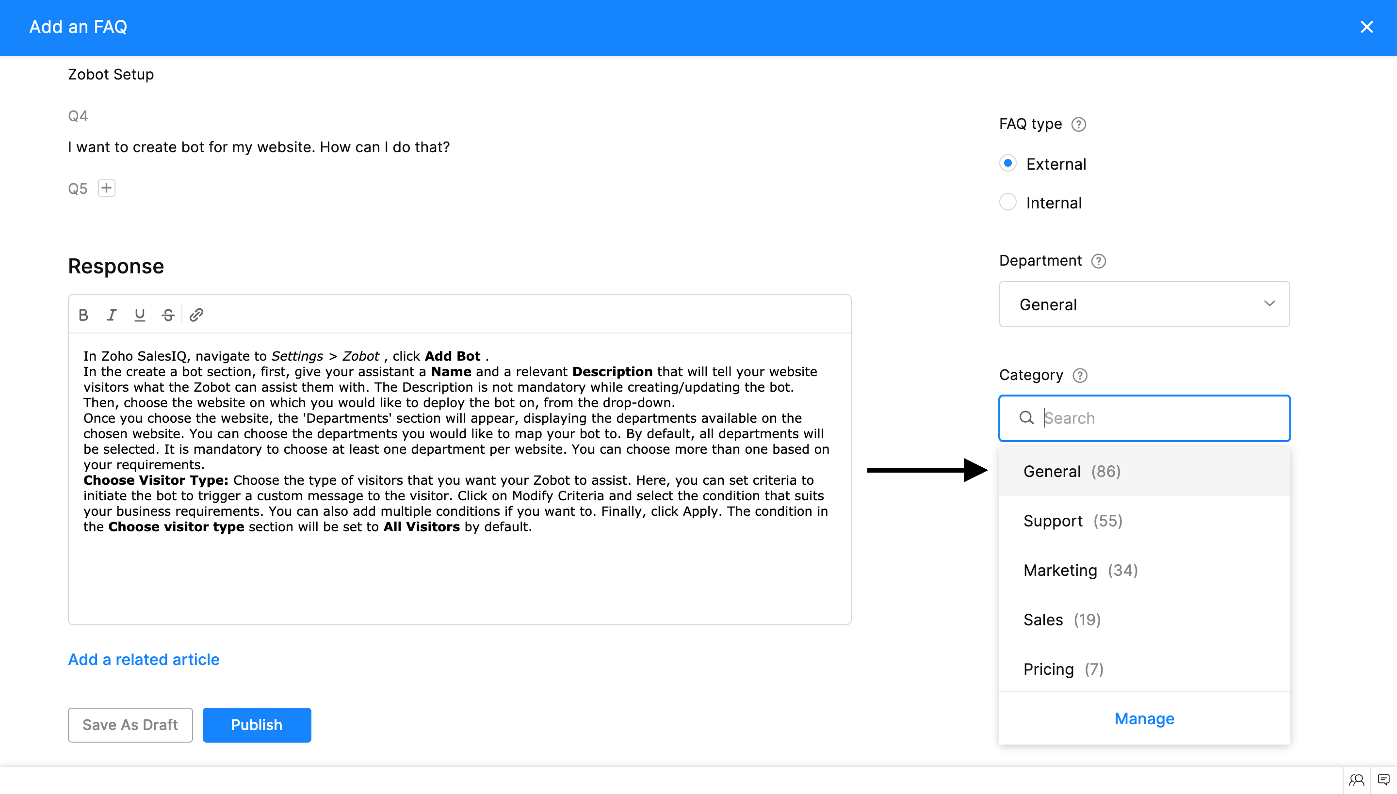 - Choose a category for the FAQ. You can choose one from the existing list or create a new one by clicking on Manage.