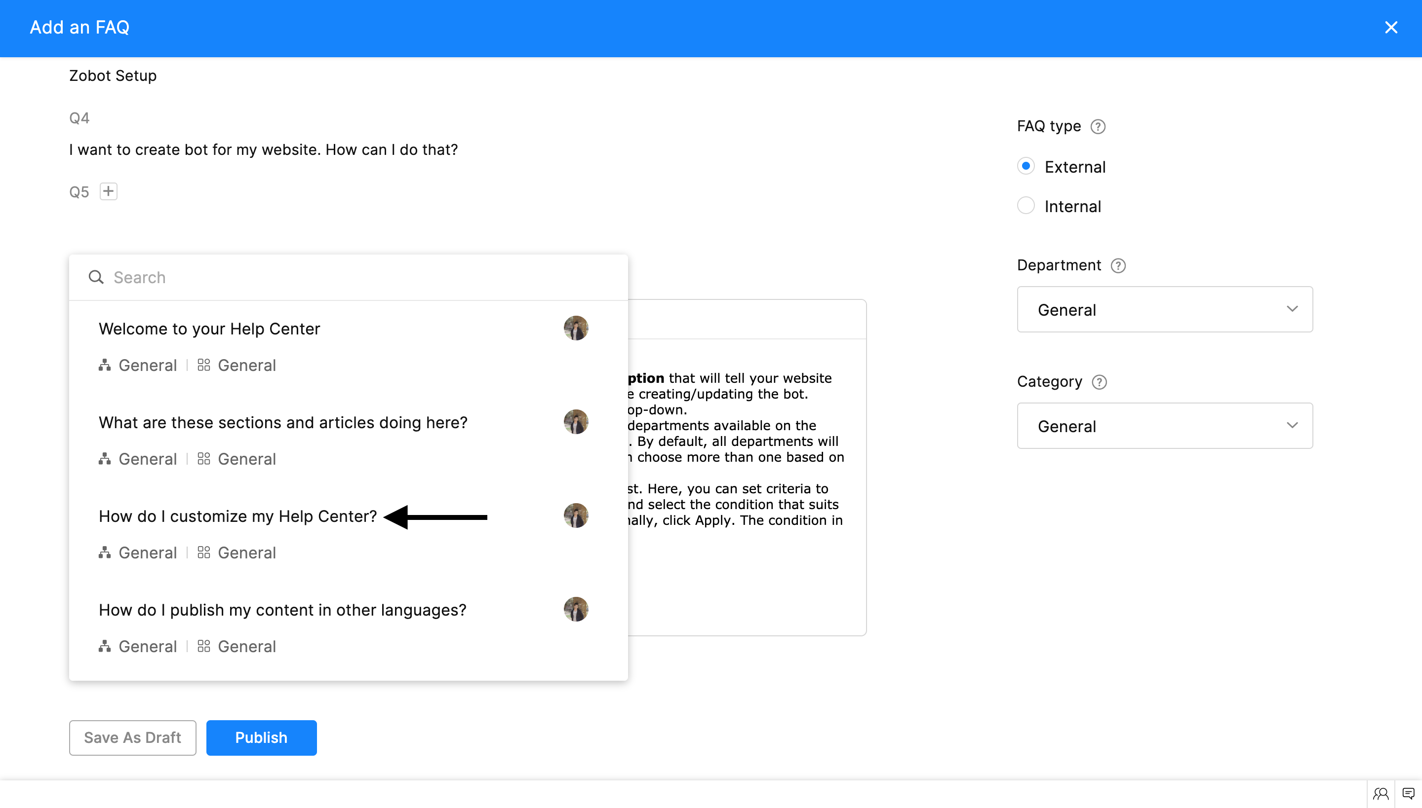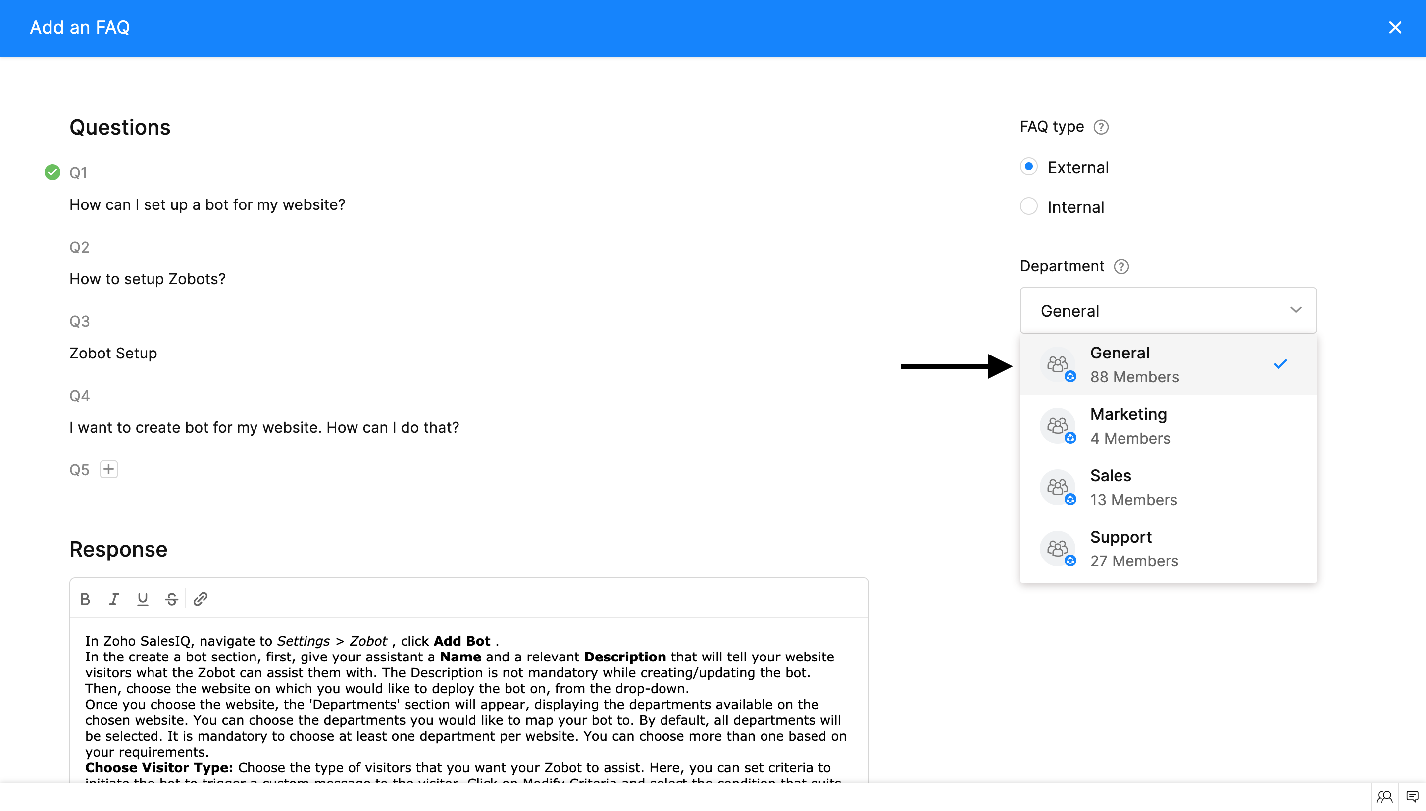 - Then, choose the department you want to associate the FAQ to. Operators can choose a department from the list of departments they are associated to.