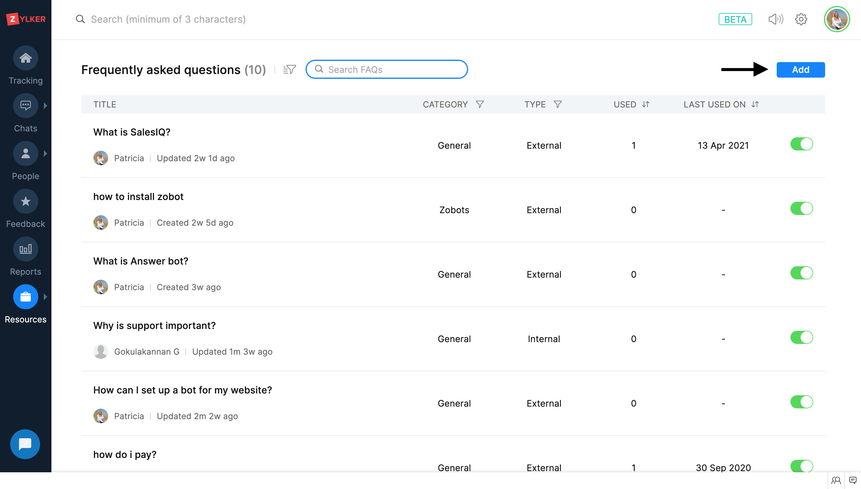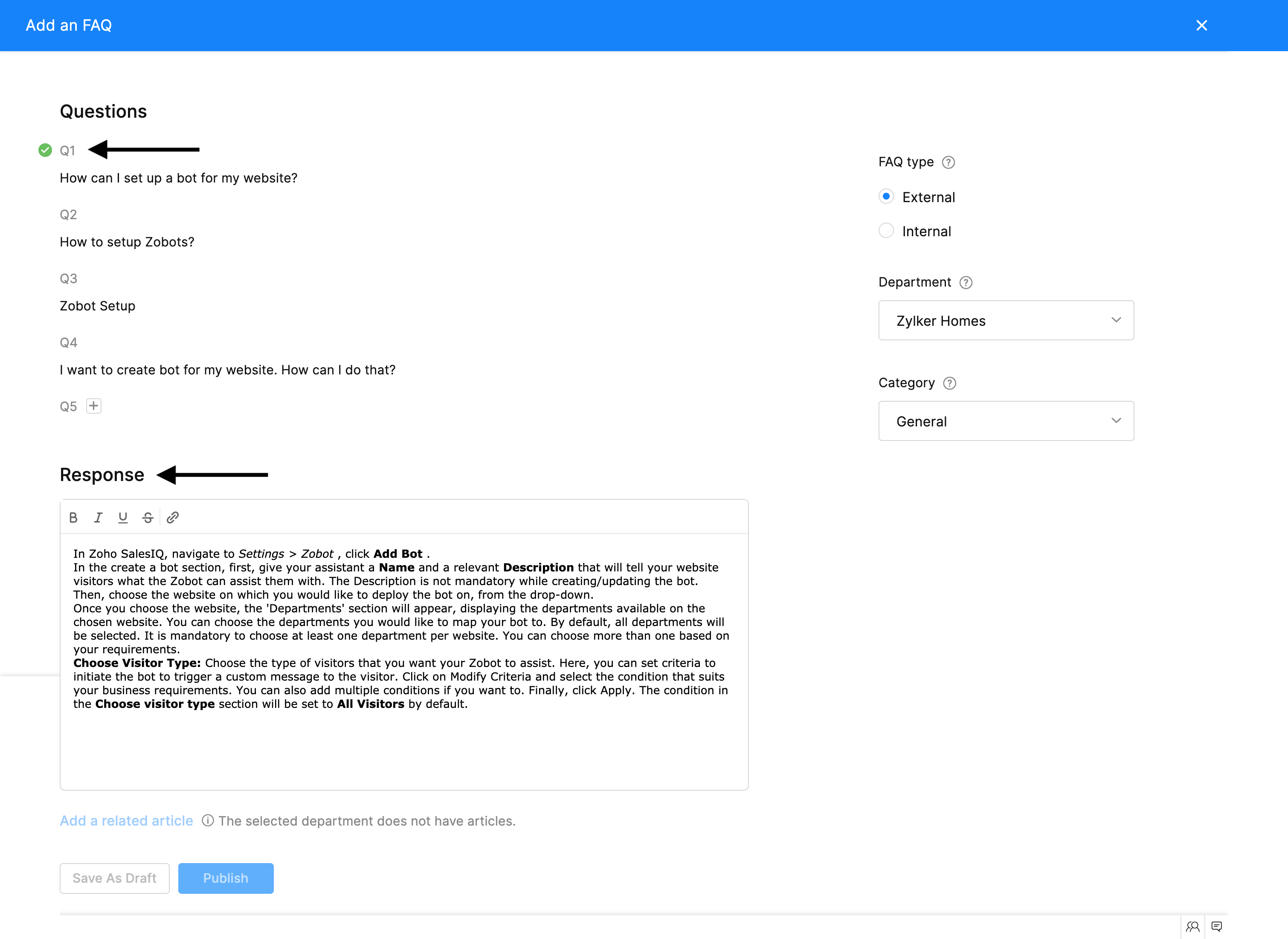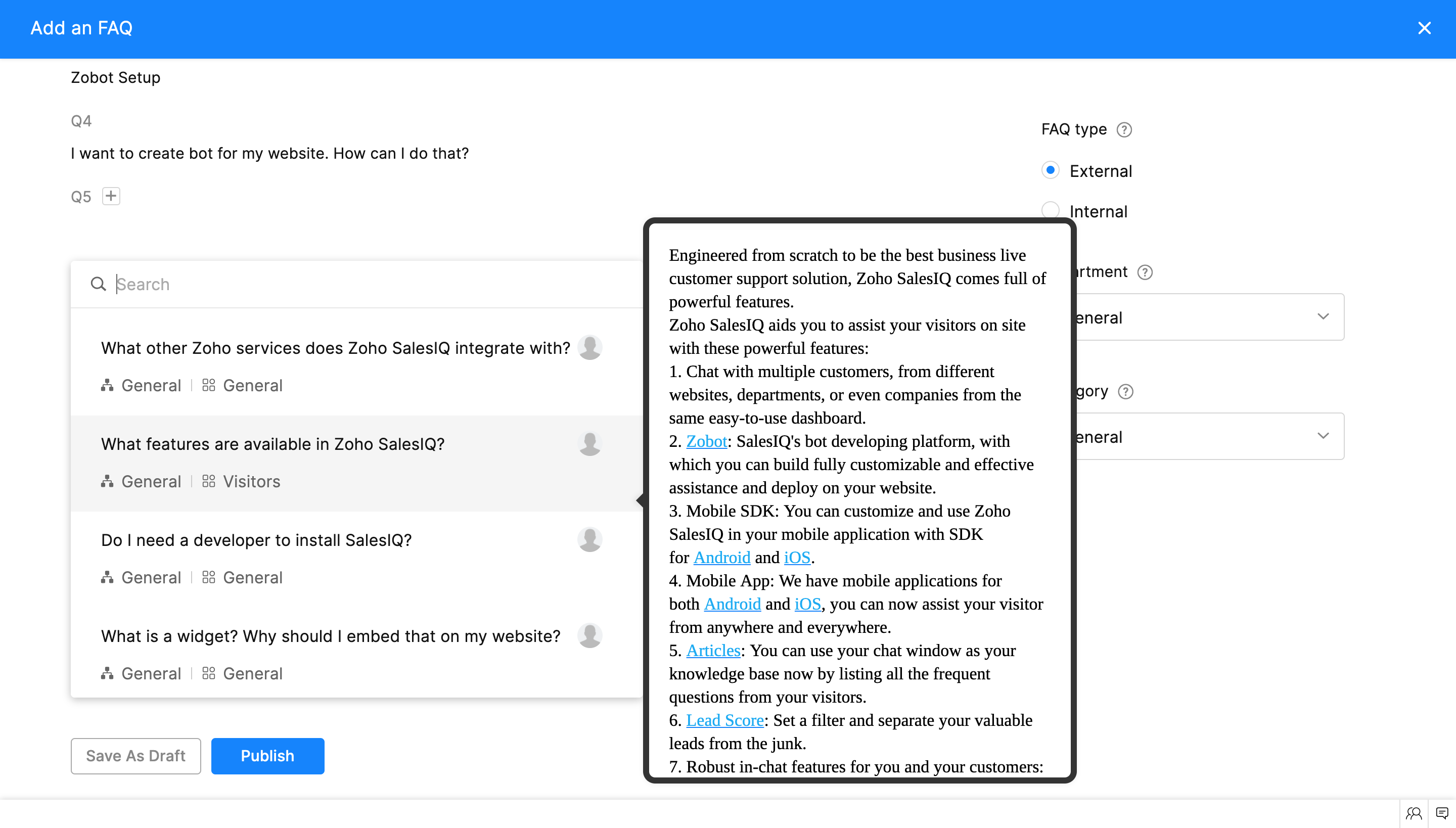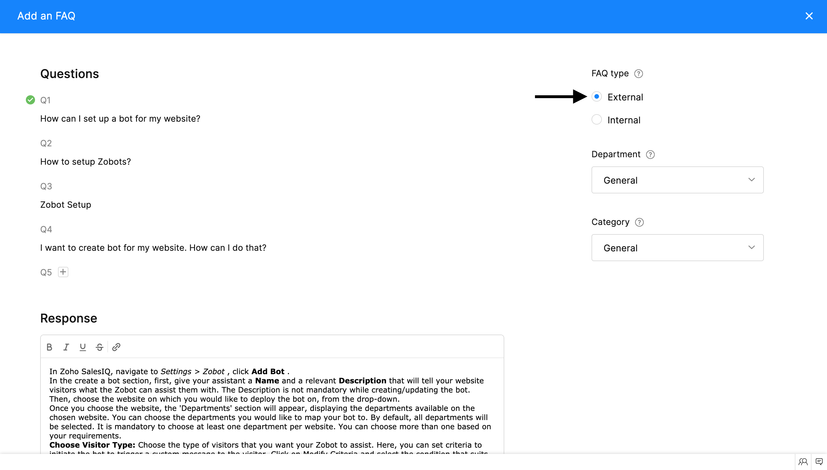 - External - These FAQs are the ones that can be directly shared by the bot during a conversation with the visitor.