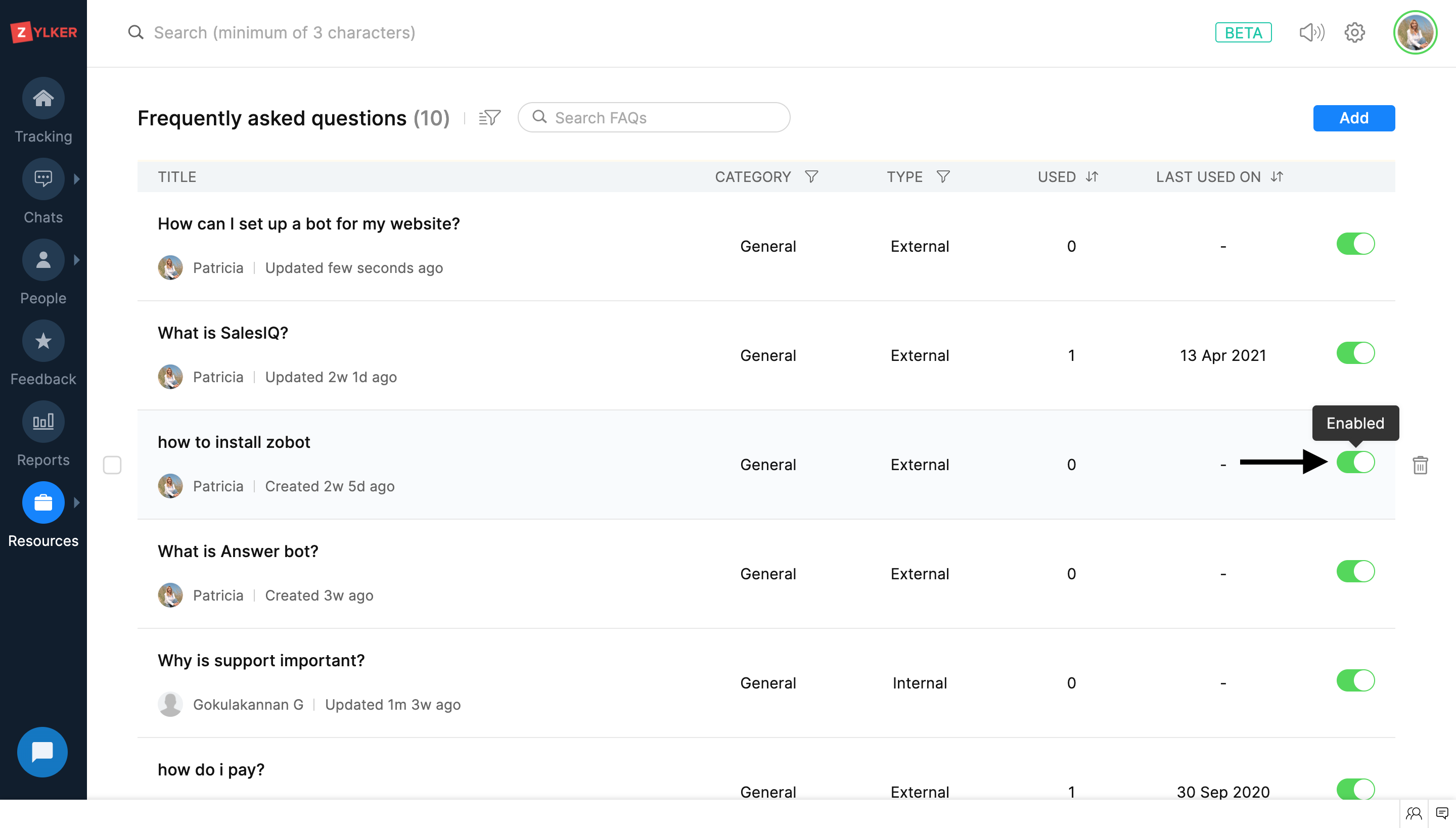- To enable/disable the FAQs, click the toggle button that appears on the right end of each FAQ.