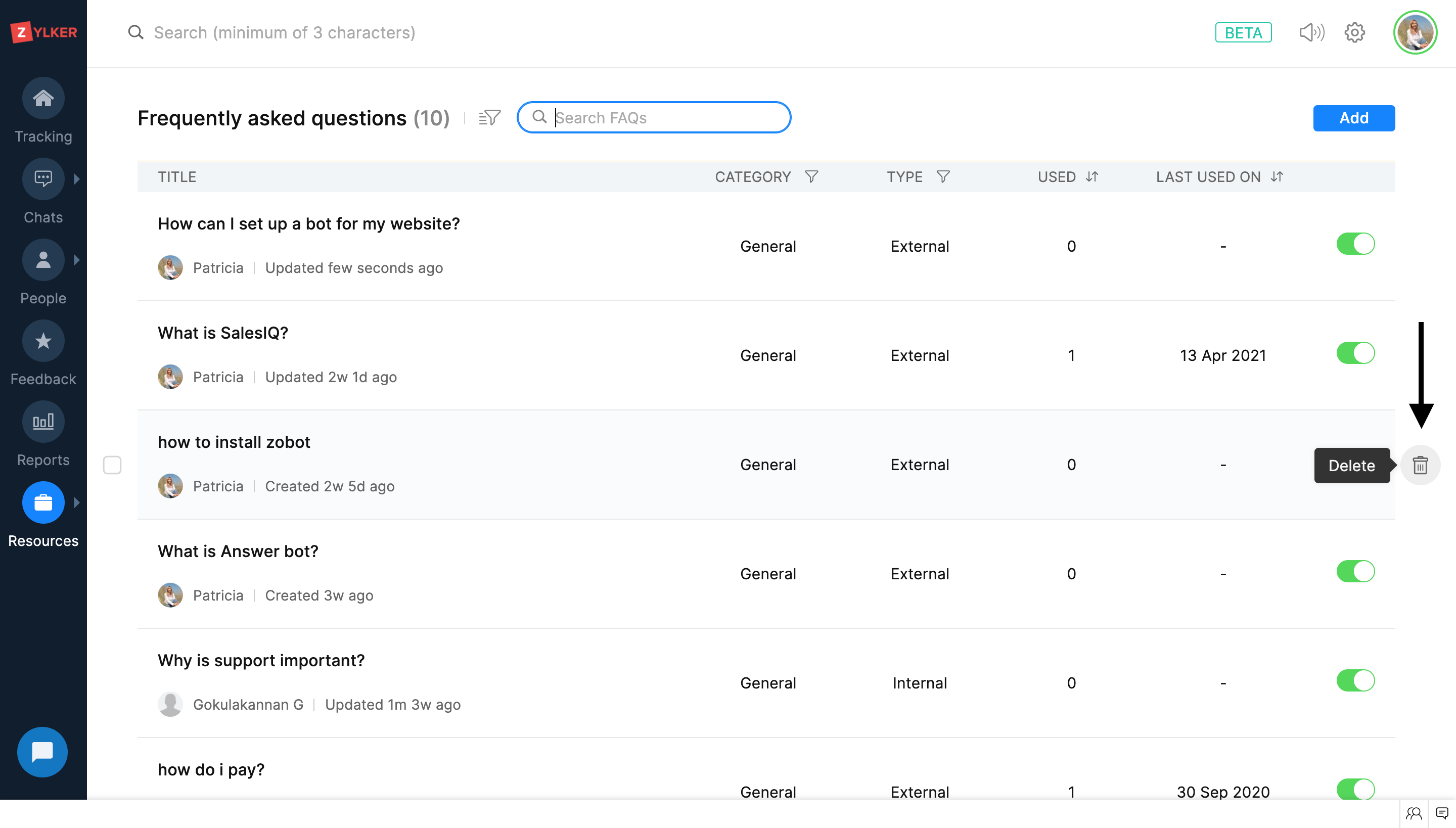 - In the FAQ dashboard, hover over the FAQ that you want to delete and then click on the delete(trash) icon on the far right.