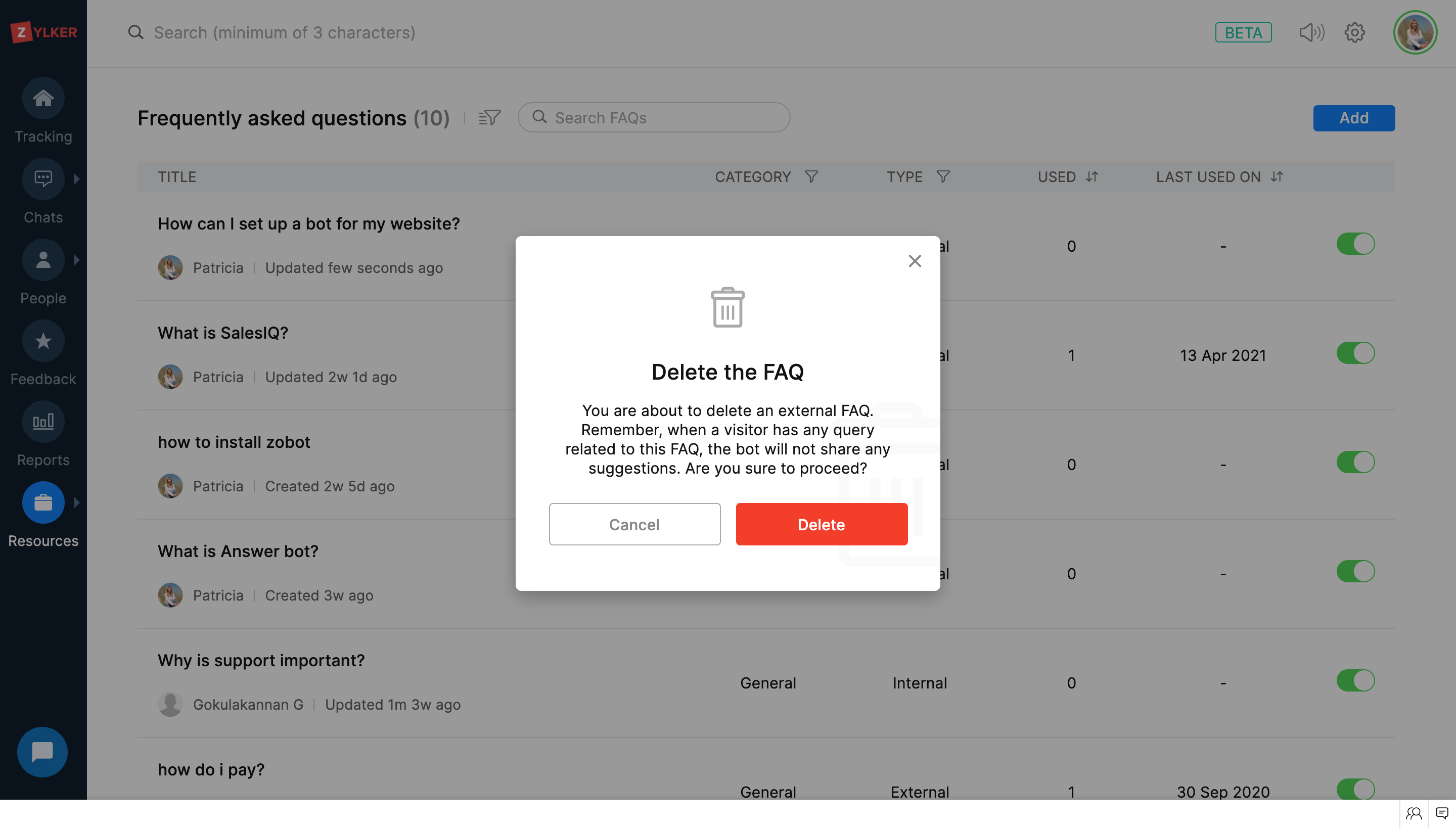 - A confirmation pop-up appears. Click Delete and the FAQ will be deleted.