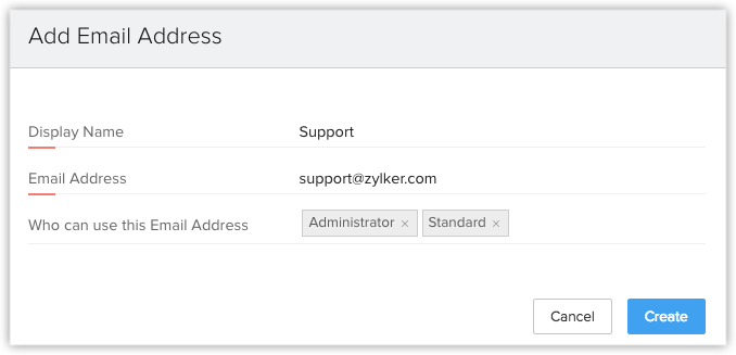 You may want to create a shared company-based email account which all users can send emails form, for example, support@zylker.com. This is referred to as an organization email address and this has to be configured by the Administrator.