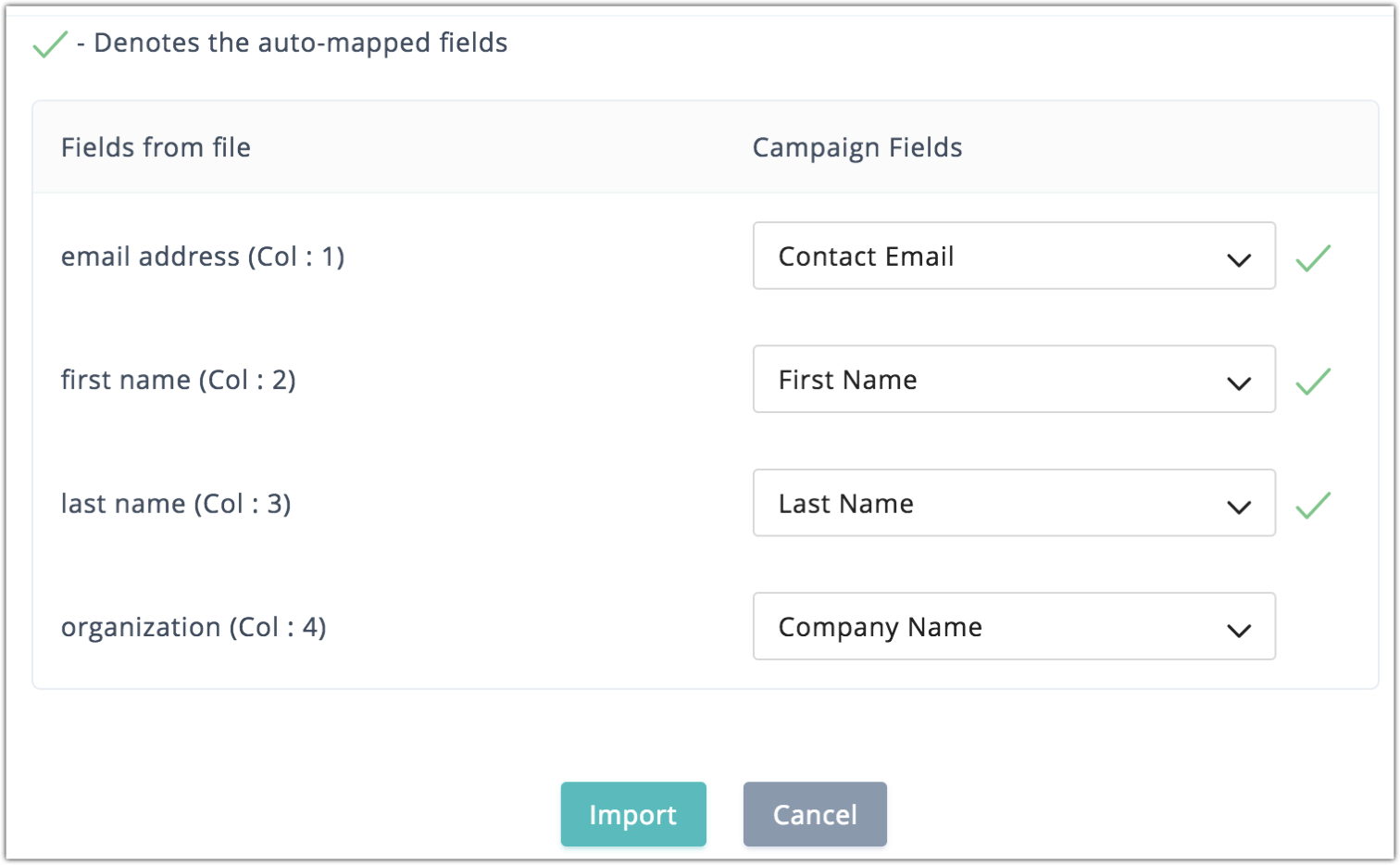 - Fields from file are pre-mapped with Campaign fields. You can change a mapped Campaign field by clicking on the Campaign Fields drop down.