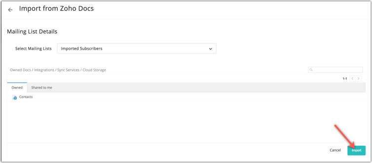 To import contacts from Zoho Docs, From the Navigation toolbar, choose Contacts and then All Contacts. Click Import. Hover over Zoho Docs and click the Import button. Choose a mailing list and the file from which you need to import. Map the fields. ...
