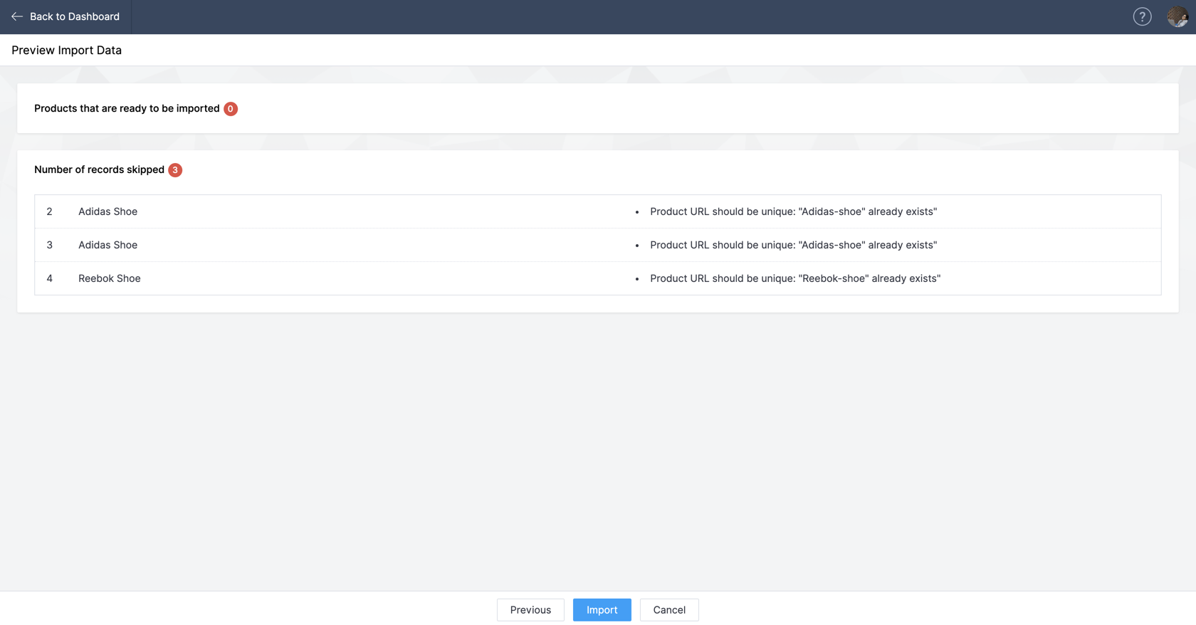 The Preview Import Data page will display the number of products to import and the number of products skipped. Products are skipped if the CSV file has missing information in the Name and Price fields. The SEO Description also has a maximum character limit of 255. If products have been skipped, you must open the CSV file and manually correct it.