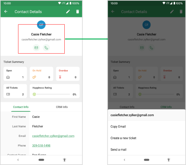 You can view not only the contact information of the customer that is available in the Zoho Desk account, but also the CRM information of the customer, if the customer is a CRM user. Click the CRM tab to view the details of the customer. If the customer is not with CRM, this tab on CRM Info will not be available for the contact.