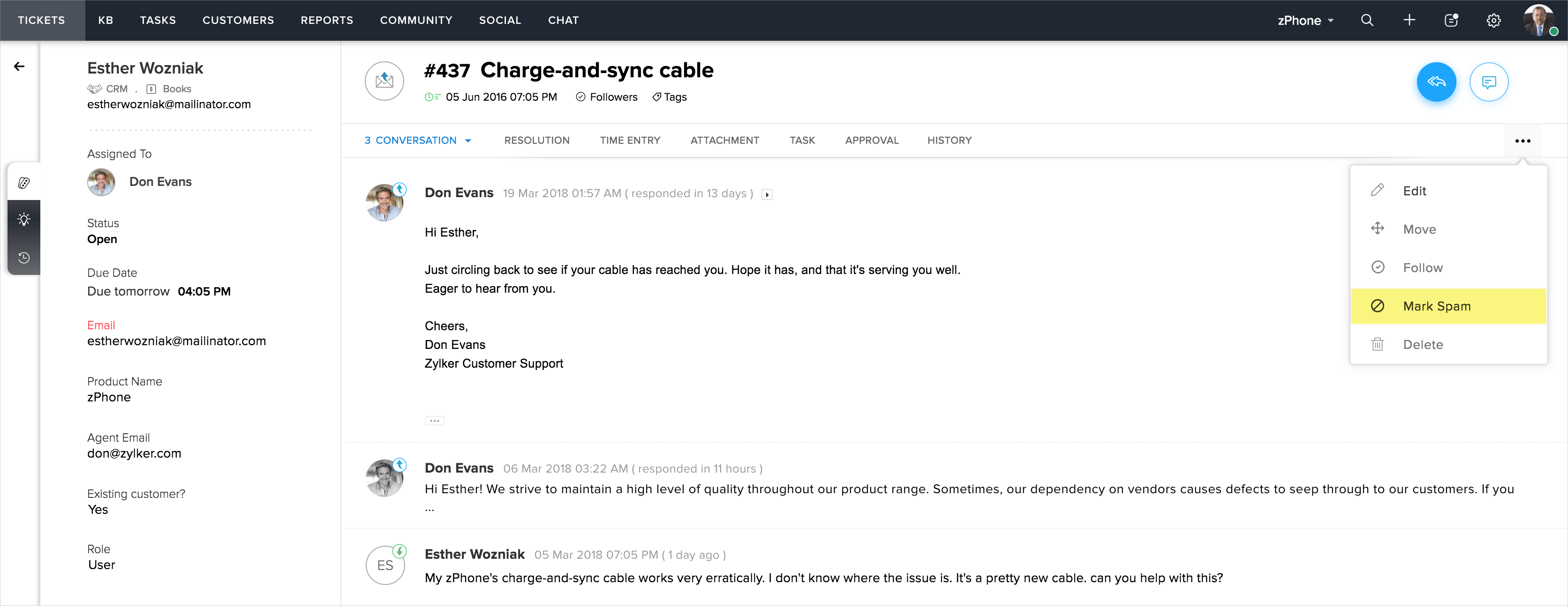 Zoho Desk automatically helps identify spam and suspicious emails to save you from having to delete them manually. It works by finding patterns across messages and learning from what Zoho Desk and Zoho Mail users like you commonly mark as spam. You can view such tickets under a separate view called Spam Tickets. You can also manually mark tickets as spam so that the undesired emails don't clutter your ticket list.
