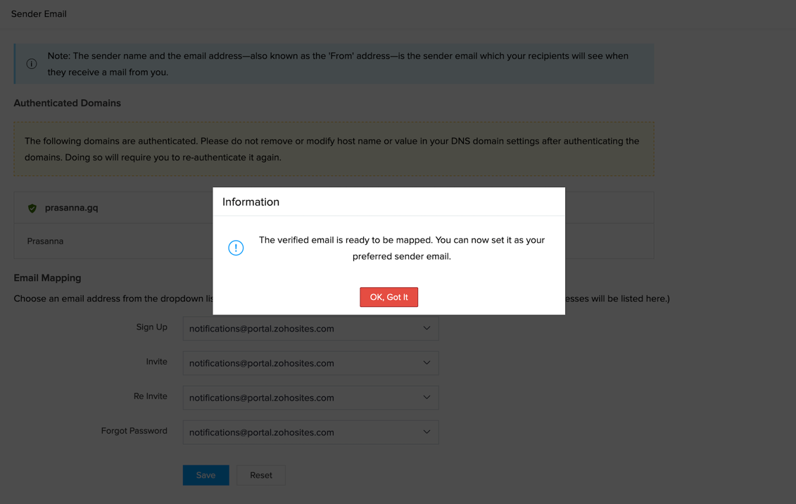 - Verified email addresses can be mapped and set as your preferred sender email.
