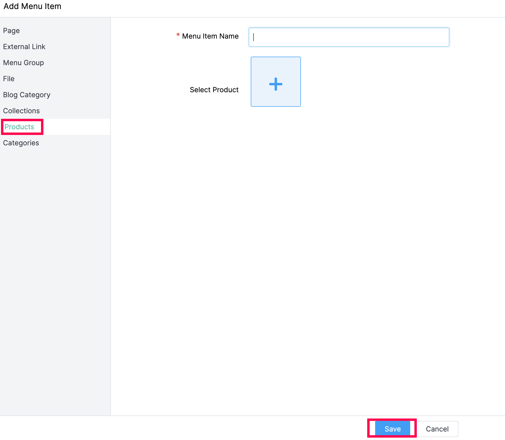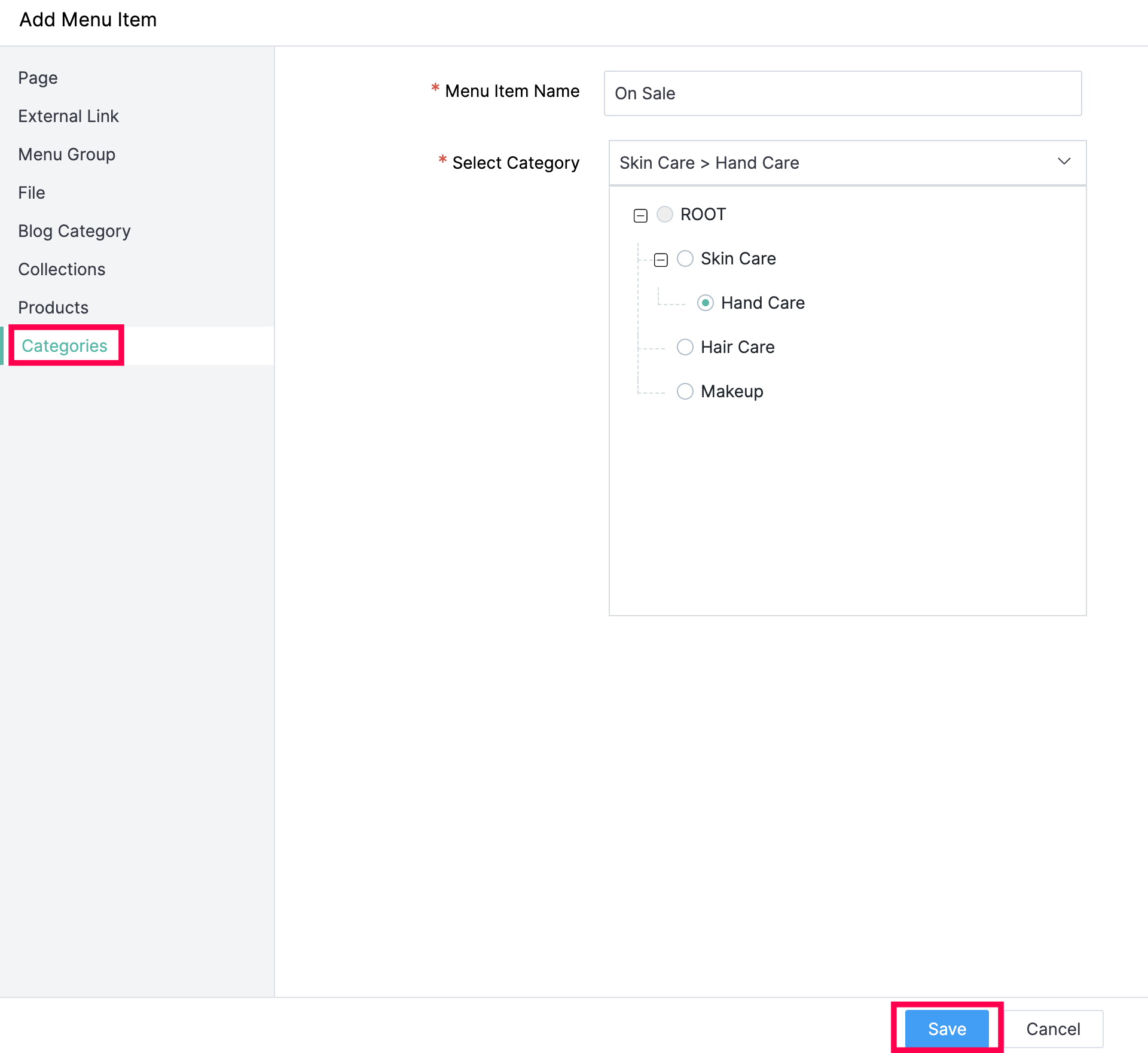 Select the product collections you want to add under this particular menu item. For example, you can group all the skin care products in your store under a menu item named Skin Care.