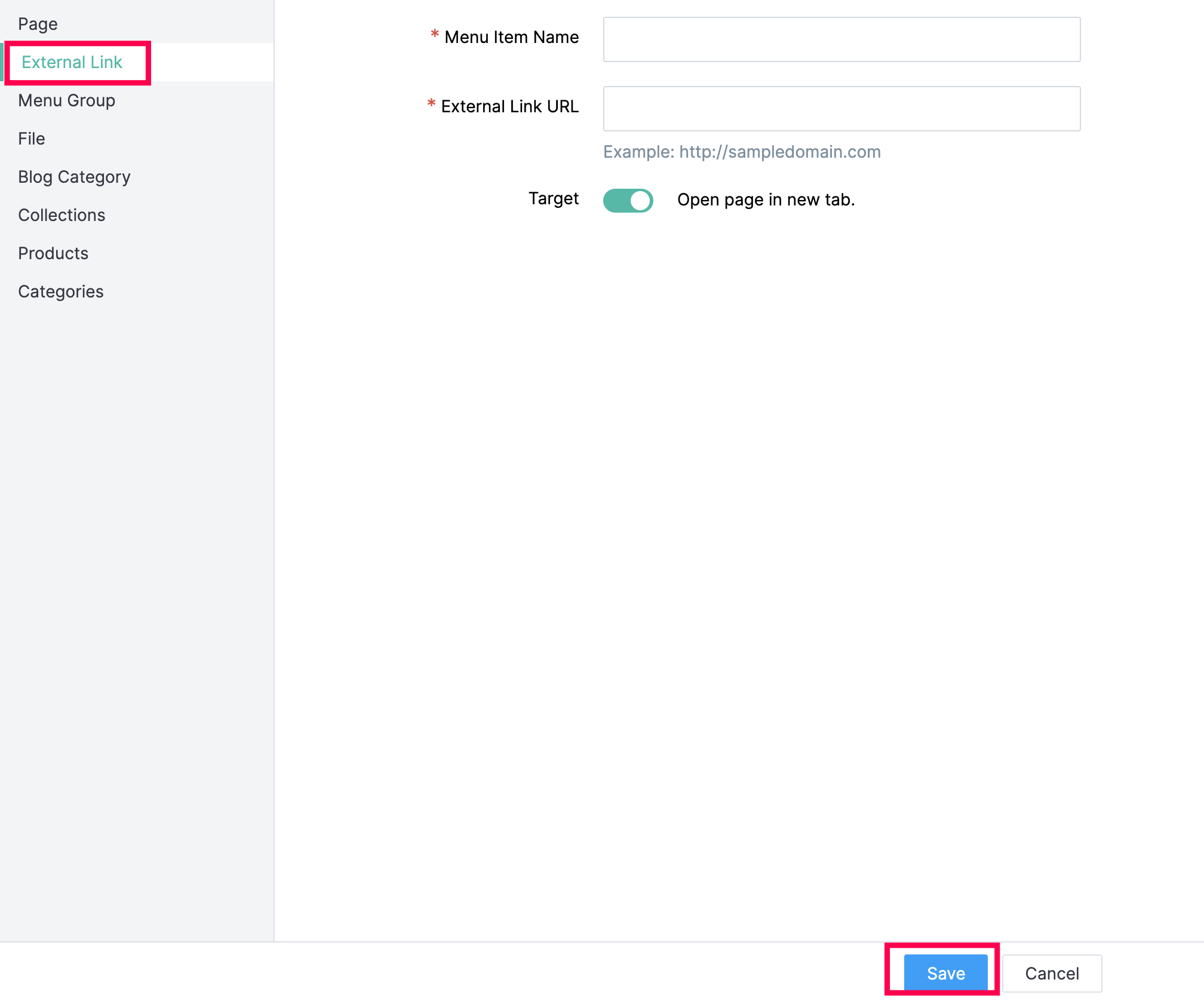 Enable the Target button if you want the menu to open in a new tab.