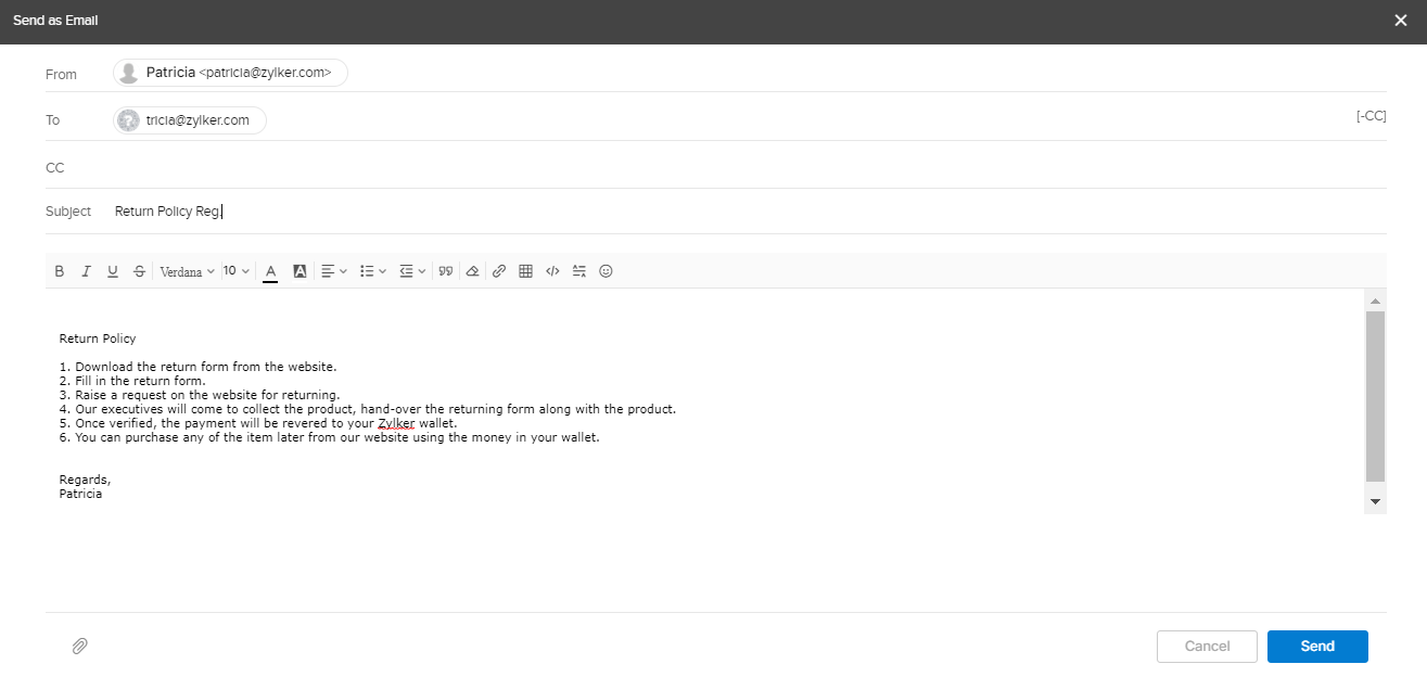 To reply to the missed request, click the Send Email button at the bottom right, and type your reply in the editor that will appear. Click Send to send the message. It is also easy to add someone to the message - just type the required email addresses in the CC field -this is an easy way to keep your supervisor or another team member who helped this customer in the loop.