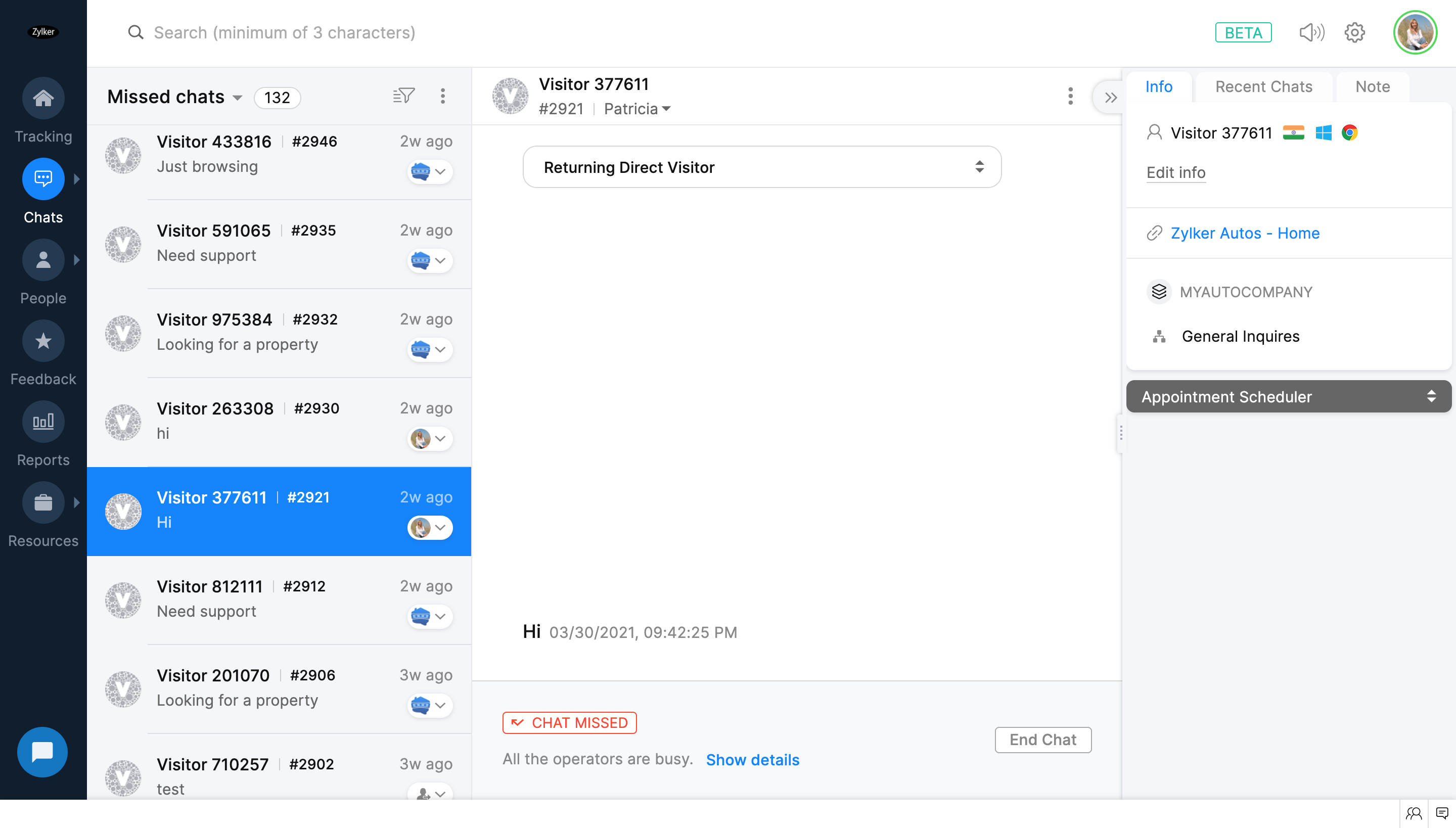 Another sub-section of the Visitors Online Module, you can access this view only when a visitor attempts to initiate a chat with your customer support operation through live chat, and neither you nor your operators answer. In the Missed Visitors view, you have access to the requests that are automatically created each time your Zoho SalesIQ misses a visitor’s chat request.