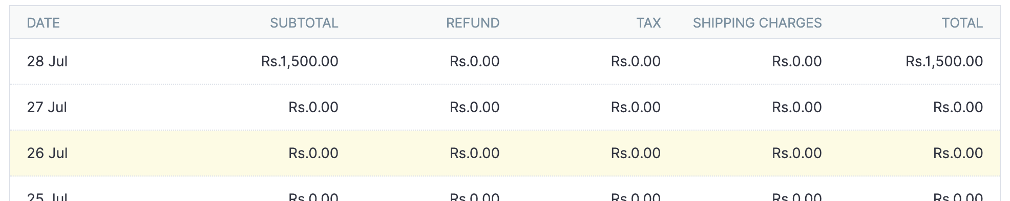 Below that, you will find the sales report tabulated with the date the order was placed, the total money earned through the order, refunds (if any), taxes, shipping charges, and the total revenue made in that order.
