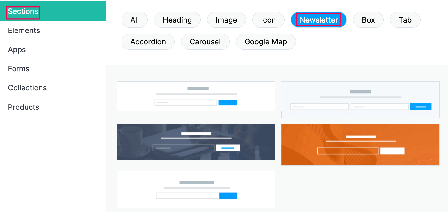A newsletter element can be found under Site Settings. You can use this element to include a newsletter section anywhere in your store.