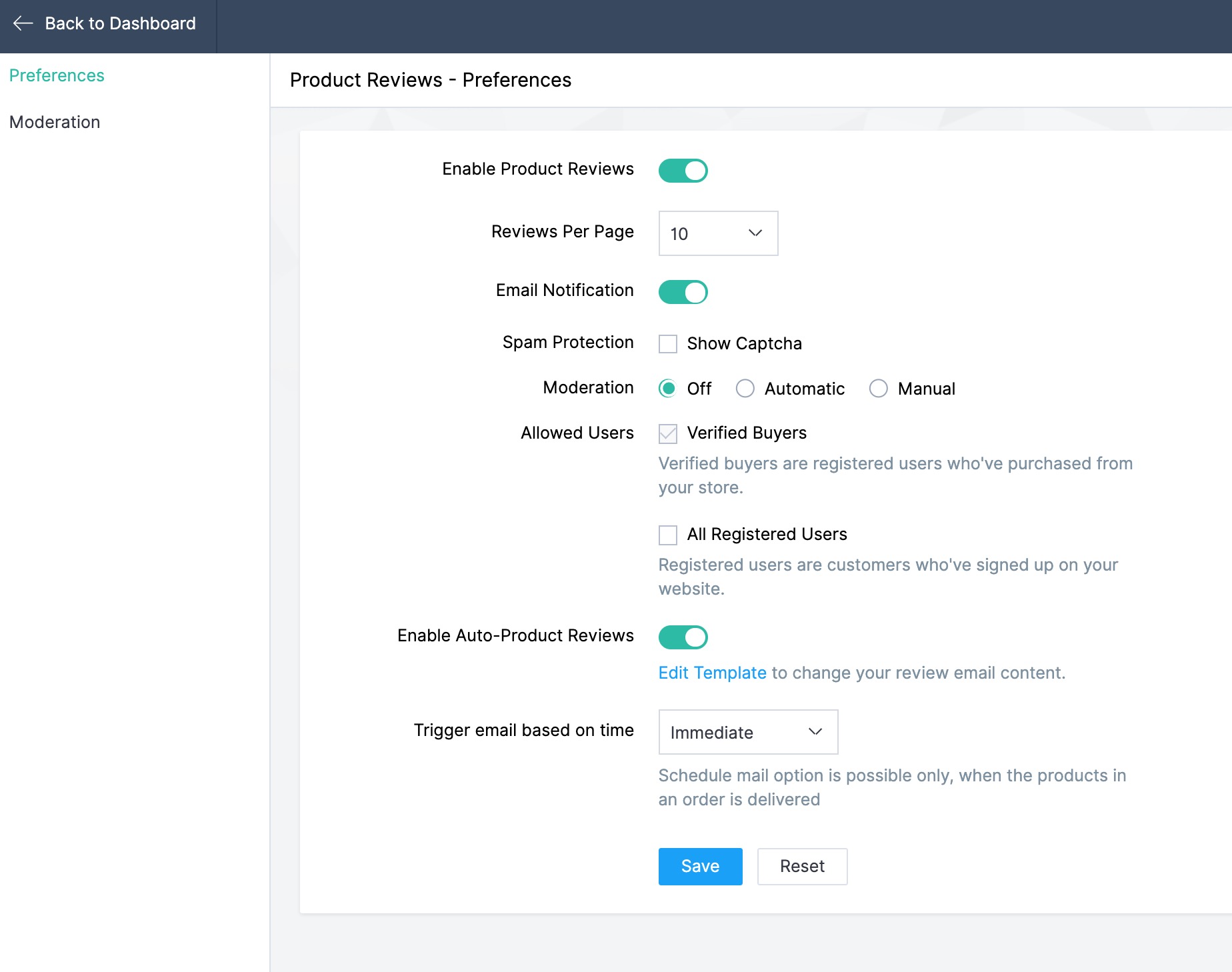 Moderation: This option helps to edit and moderate customer reviews in your store, in order to prevent spamming.