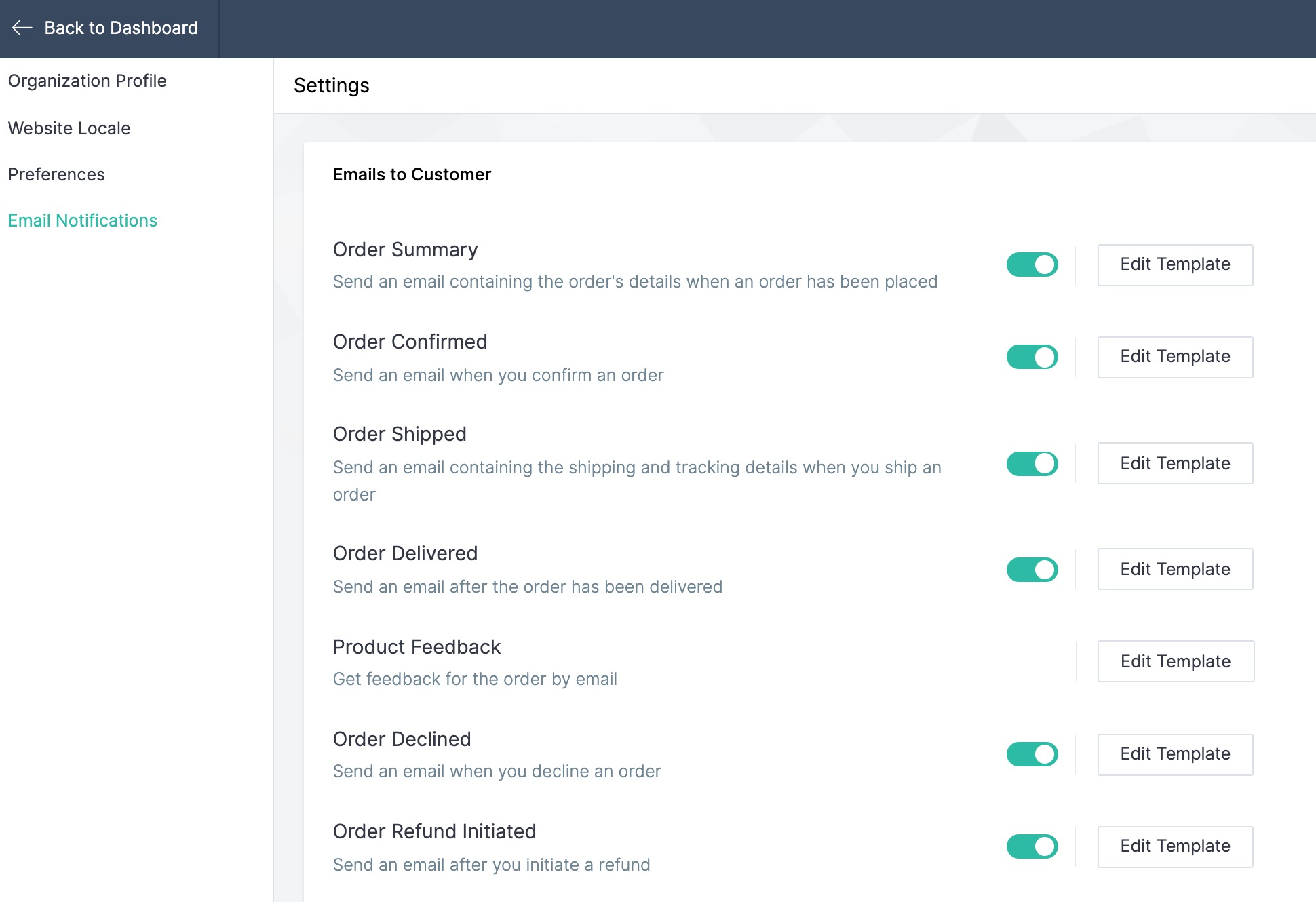 Click Edit Template to be redirected to the Email Notification page. Otherwise, go to Settings > Email Notification under Store Settings.
