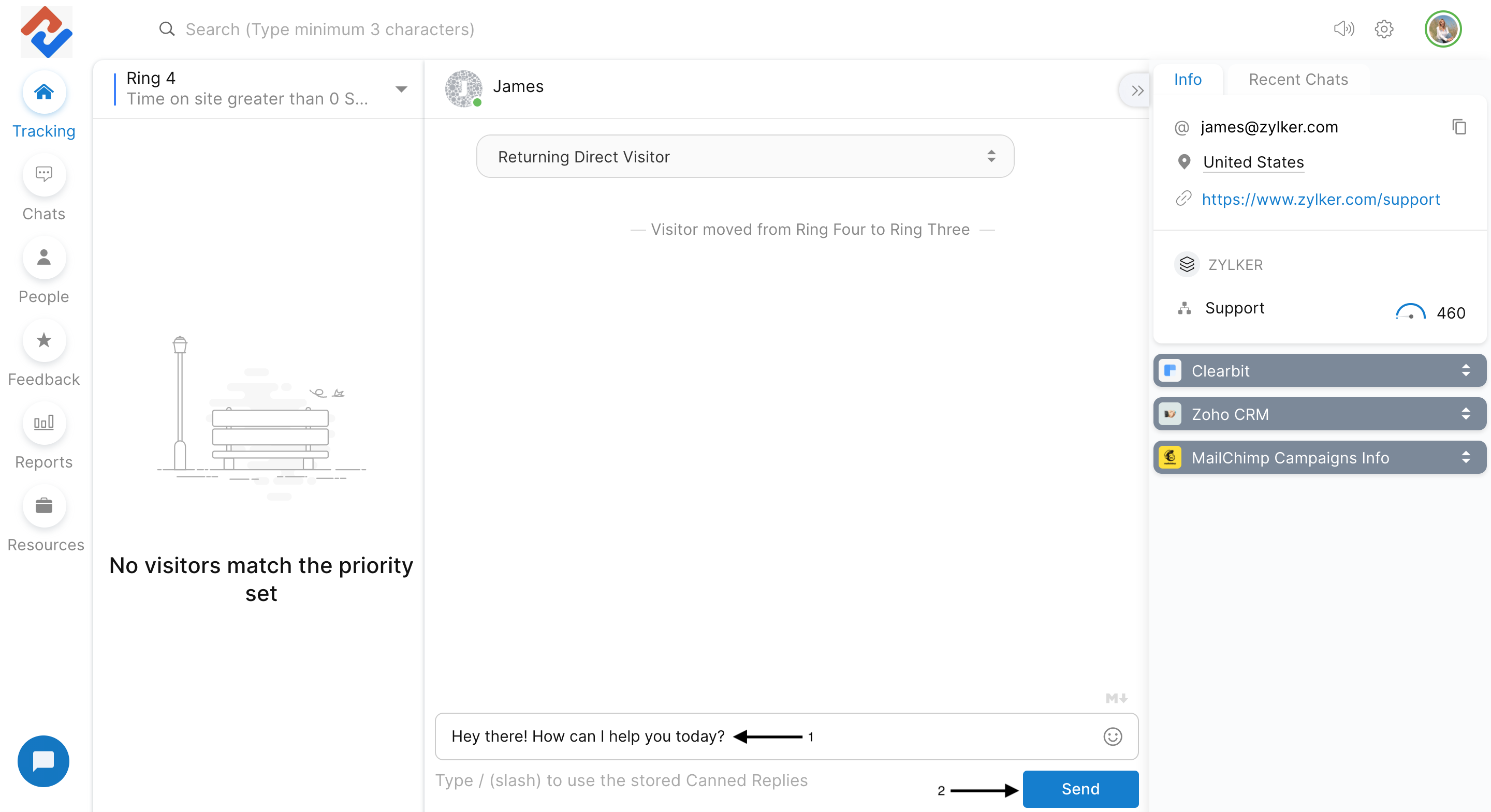 SalesIQ allows you to filter, prioritise and organize the website visitors based on the criteria you have set. This can viewed in both rings/list view. Prioritizing the visitors will help you in assisting your firm's target prospective visitors rather than approaching the visitors who may not be a prospect. Learn more