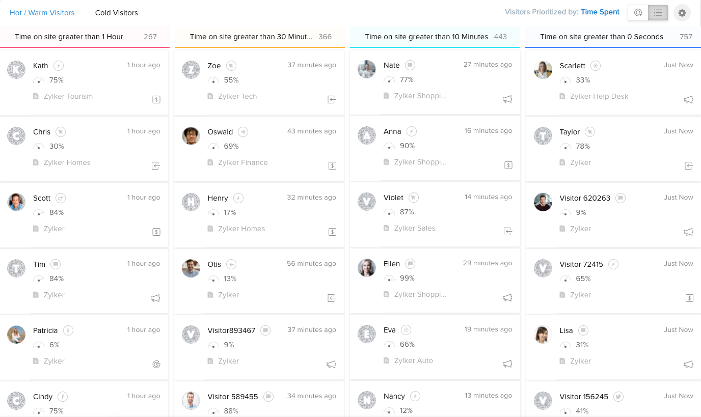 In this view, you can filter and prioritize visitors, to categorize and organize your visitor base into columnar data based on the criteria specified by you. You can also track a set of predefined actions that can be tracked right away from this list view. Learn more