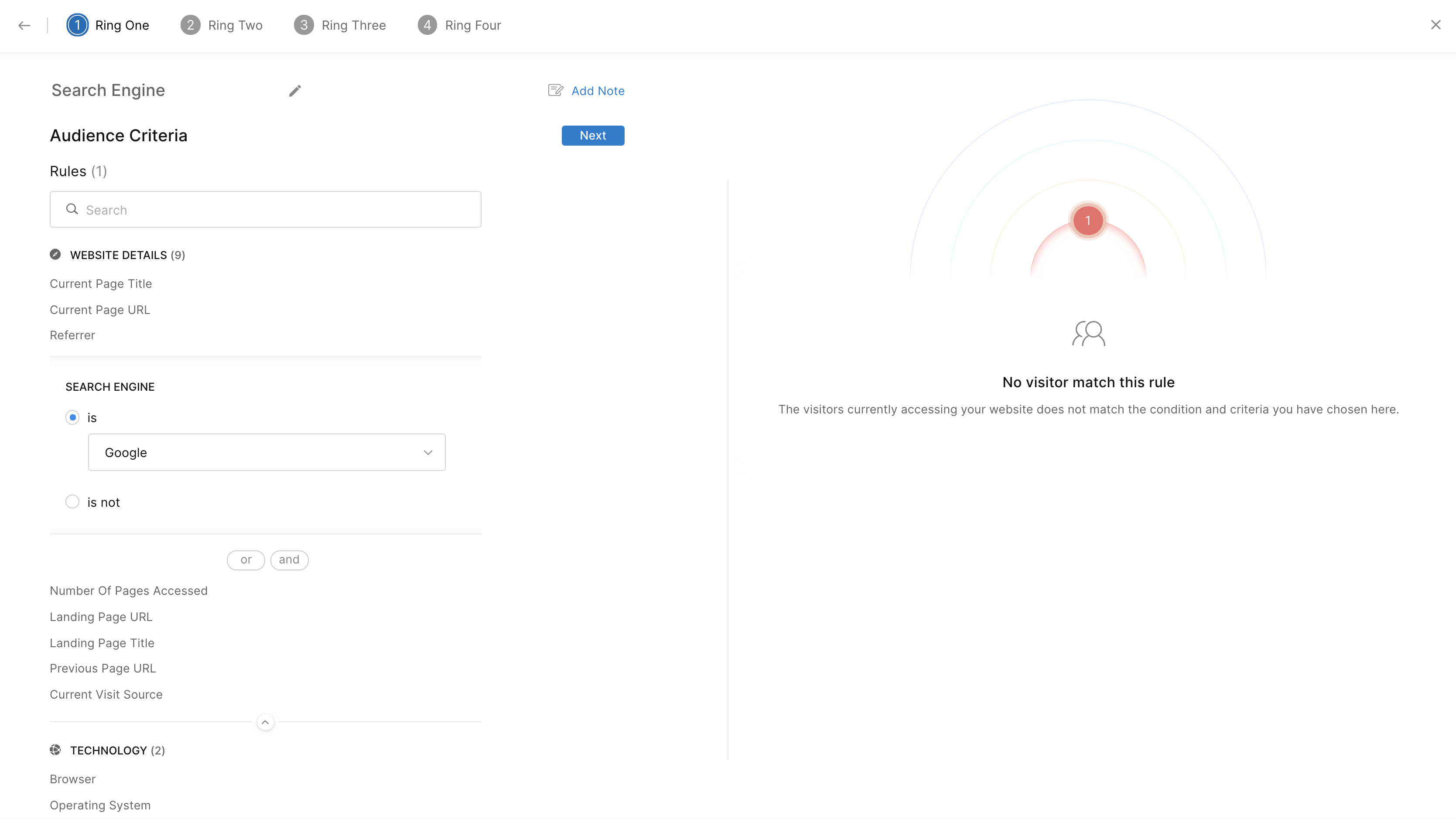 You can filter and prioritize visitors hitting the website in rings view based on the criteria you have set. Visitor details like name/random ID assigned to the visitor, time spent by the visitor on your website, country from which the visitor is accessing the website etc would be displayed in the small tiles for the visitors who are currently browsing through your website. You can also track a set of predefined actions performed by the visitors just by having a glance at your priority rings. Learn more