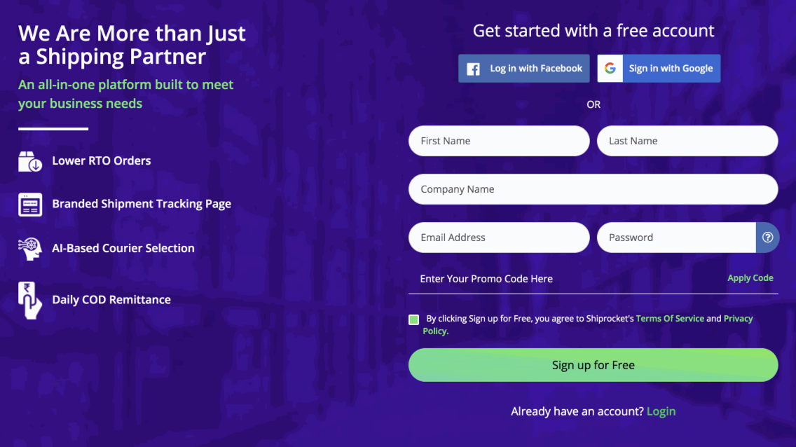 3. This will take you to the home page of Shiprocket. Use your login credentials to enter the seller panel.