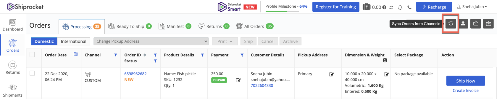 A new channel will take anywhere between 30-60 minutes to get automatically synced and update the orders on your dashboard. To immediately get the orders synced, use the Manual Sync option available.