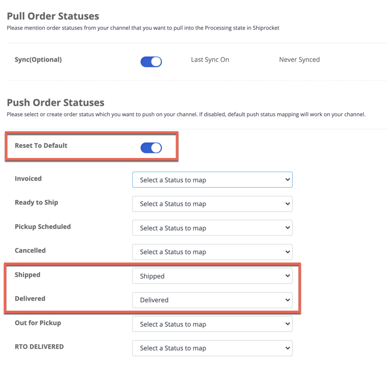 12. Enable Push Order Statuses to update the status of the orders at each level. You can select each status from the available drop-down options.