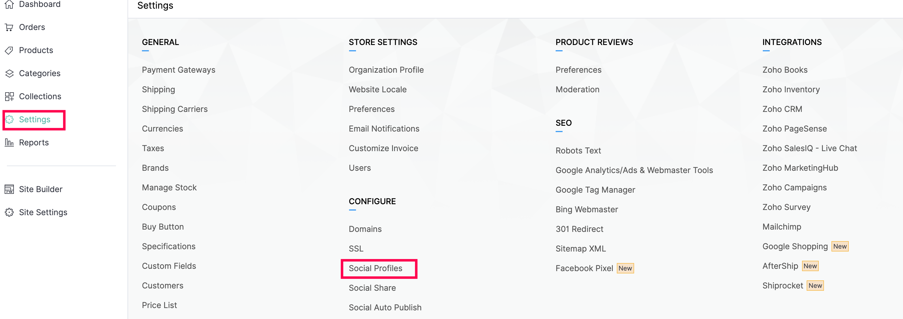 This feature enables you to change the display image of your website in social profiles. The image you upload as your Social Preview Image will be displayed when your store name is searched for in social media. Go to Site Settings > Social Preview ...