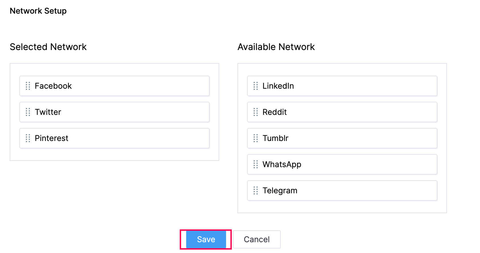 All the social networks selected for your store will be displayed under Selected Network. You can drag and drop the social network names from Available Network to Selected Network.