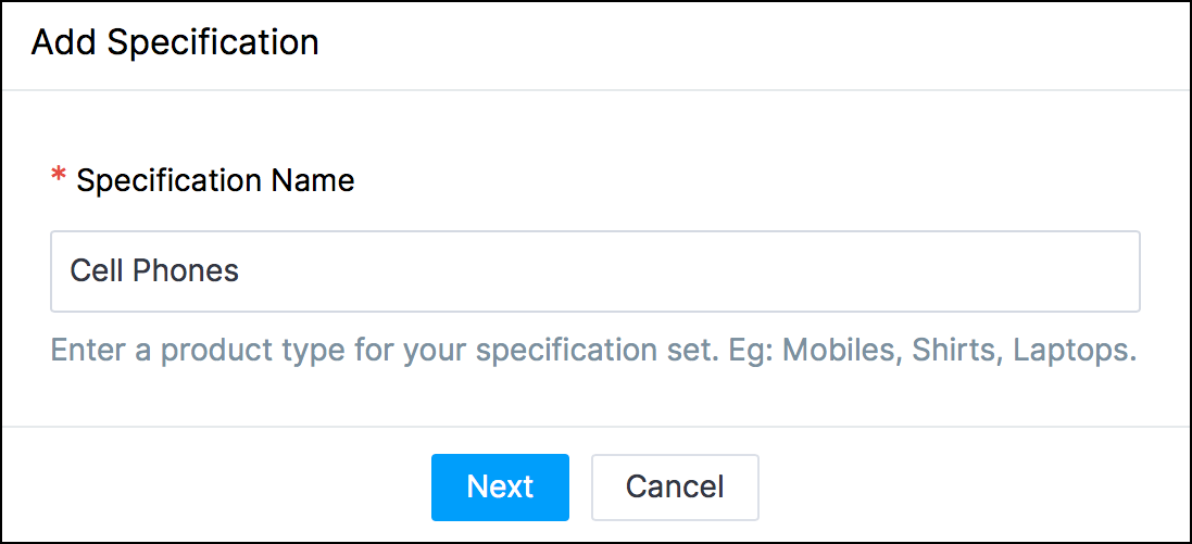 Enter your product type (Mobiles, Computers) as your Specification Name and click Next.