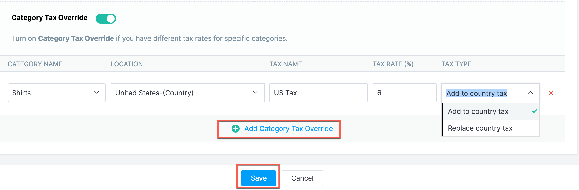 Select the Tax Type, either Add to country tax or Replace country tax.
