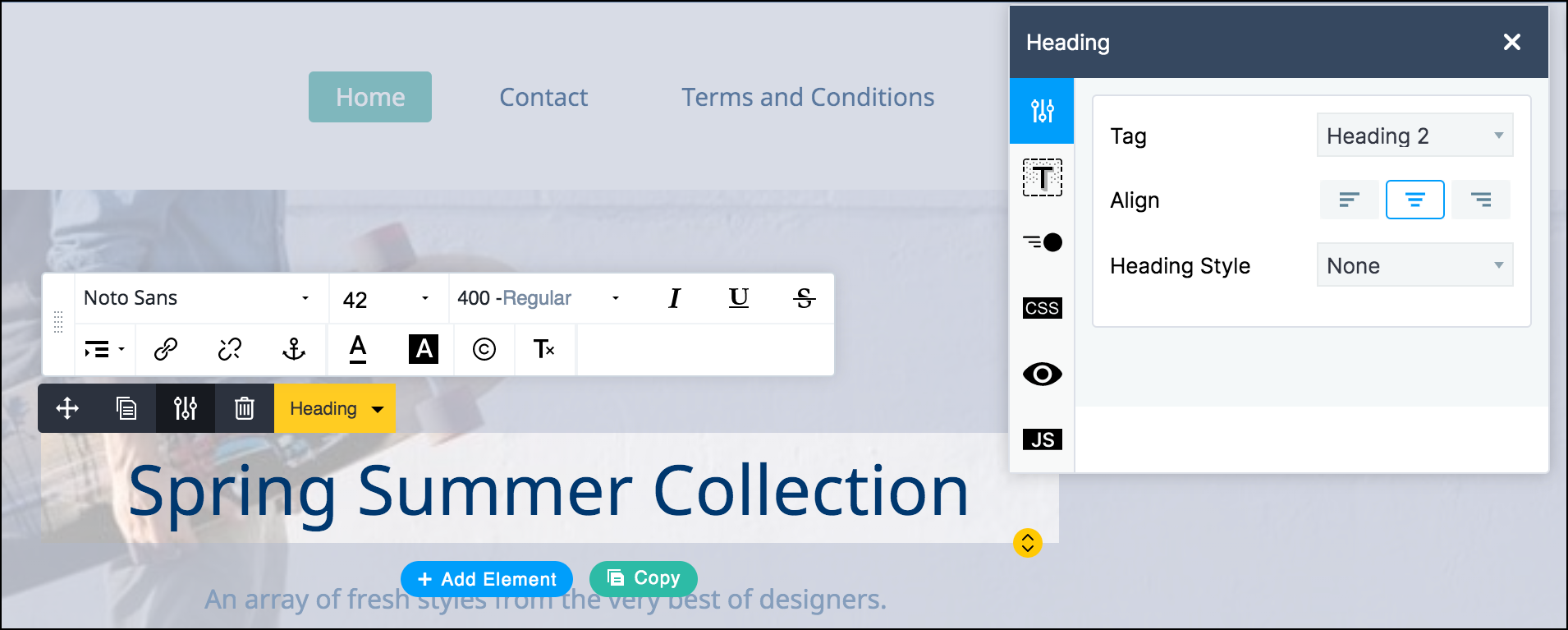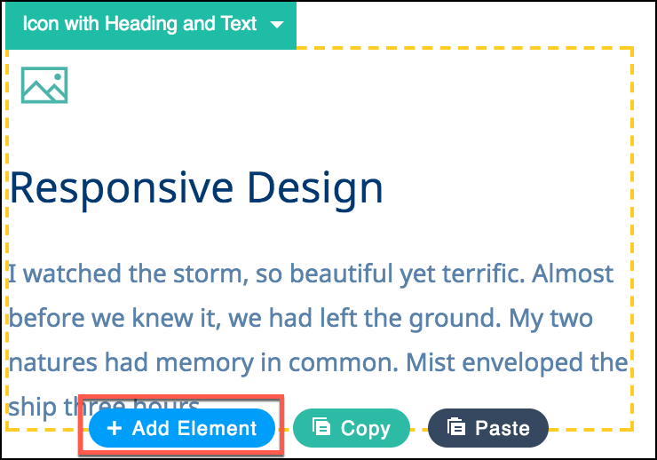 Each element comes with its own set of customization options. You can find these tools alongside the element, after you have added it to your page. They also appear when you click an element.