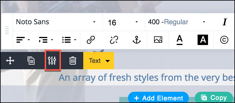 In addition to editing text, each element comes with its own set of customization options. You can find these tools alongside the element, after you have added it to your page. They also appear when you click an element.
