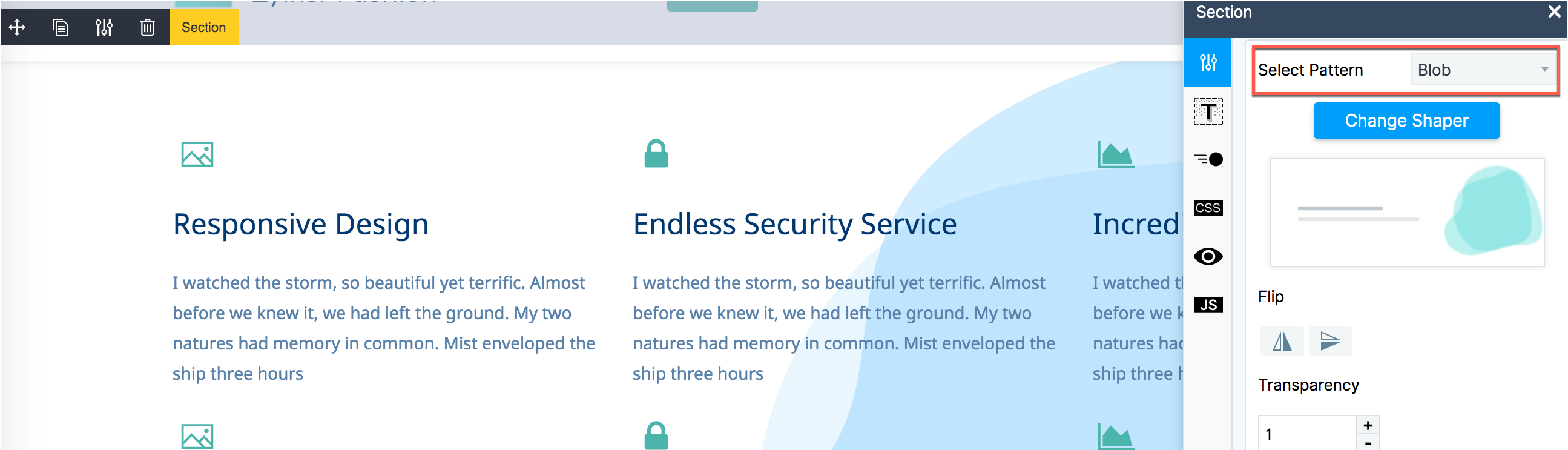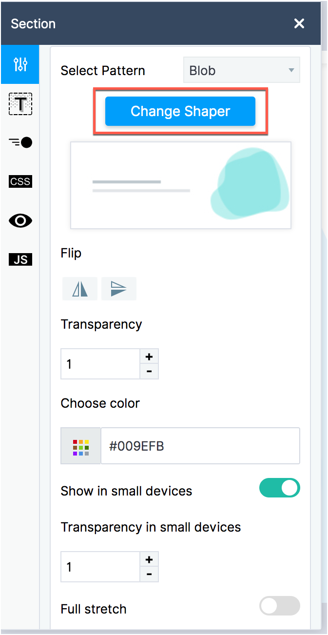 You can edit the shaper based on its properties. Some Shapers have transparency, while others have solid colors. You can also choose whether you want them to be displayed in mobile devices. You can edit these properties by toggling their settings in the pop-up tool box.Click Change Shaper to select a new Shaper.