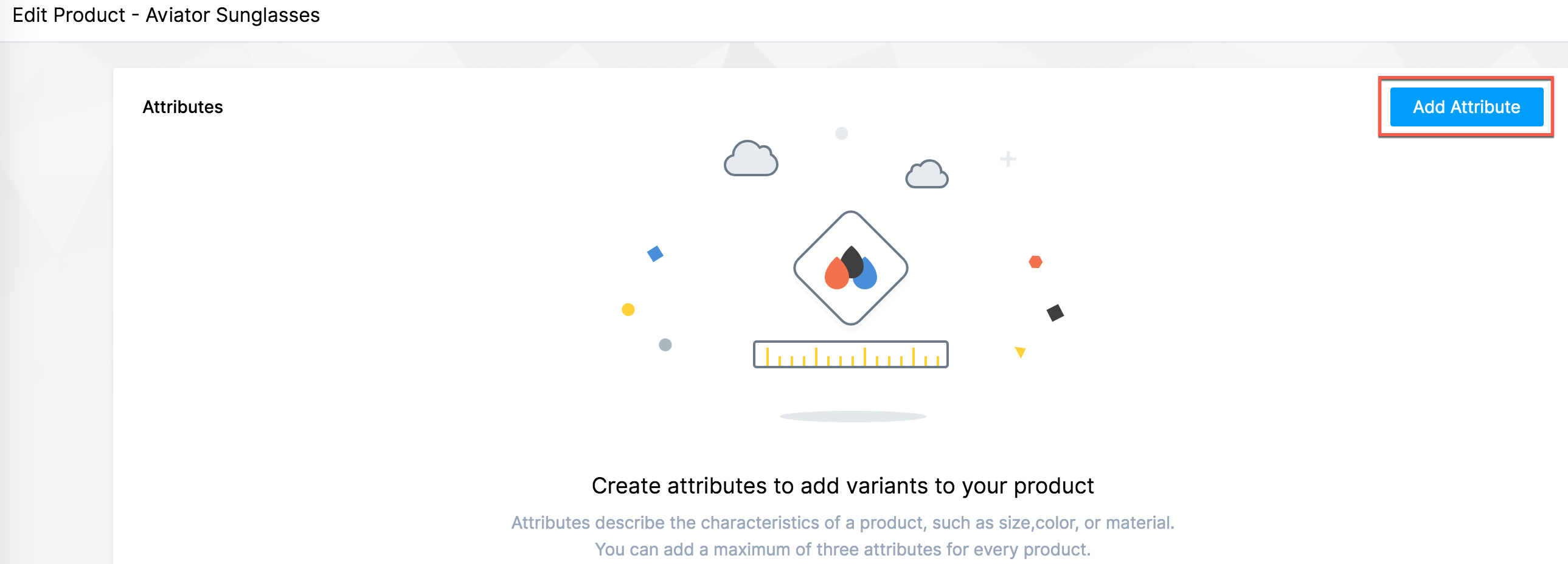 Scroll down to the Attributes section. Attributes are key parameters that a product can have, such as size and colour. Click Add Attribute.