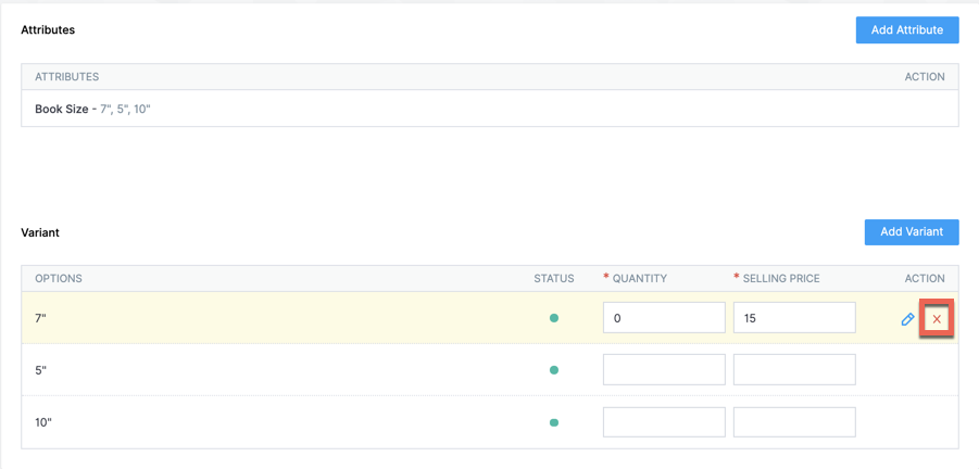Hover over the attribute or variant and click the Delete [] icon.