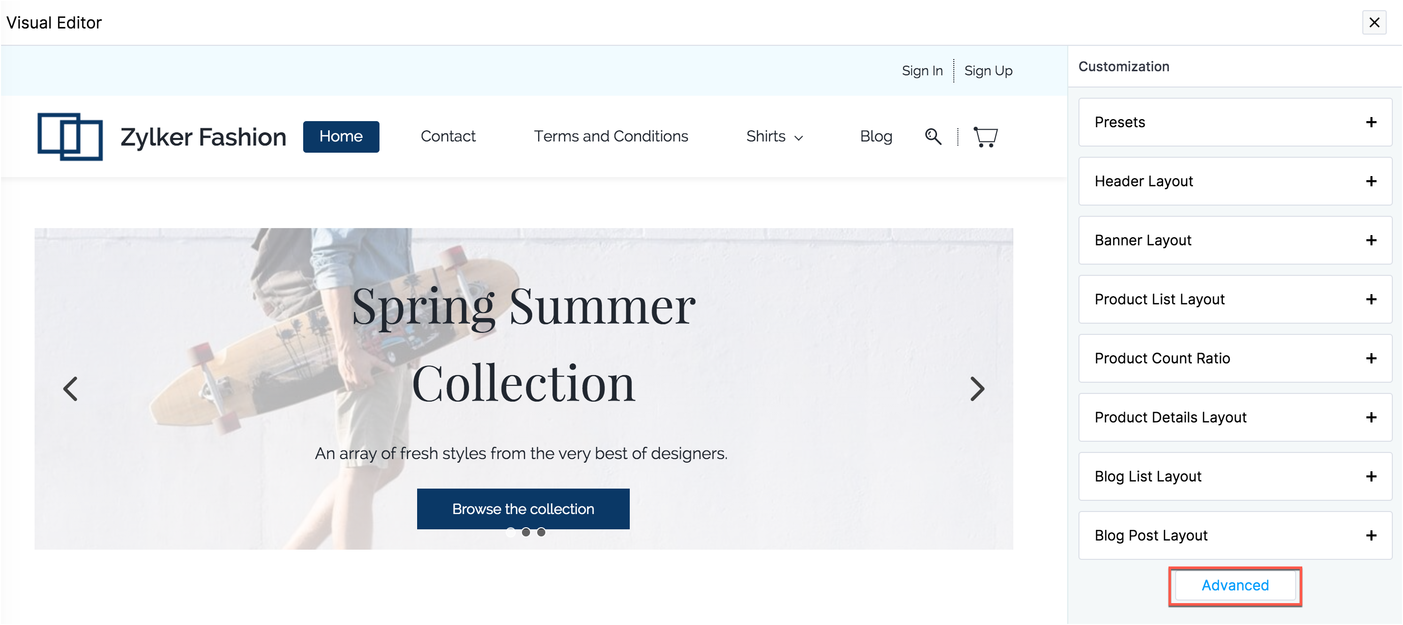 1. On the Visual Editor, click Advanced at the bottom of the customization menu on the right.