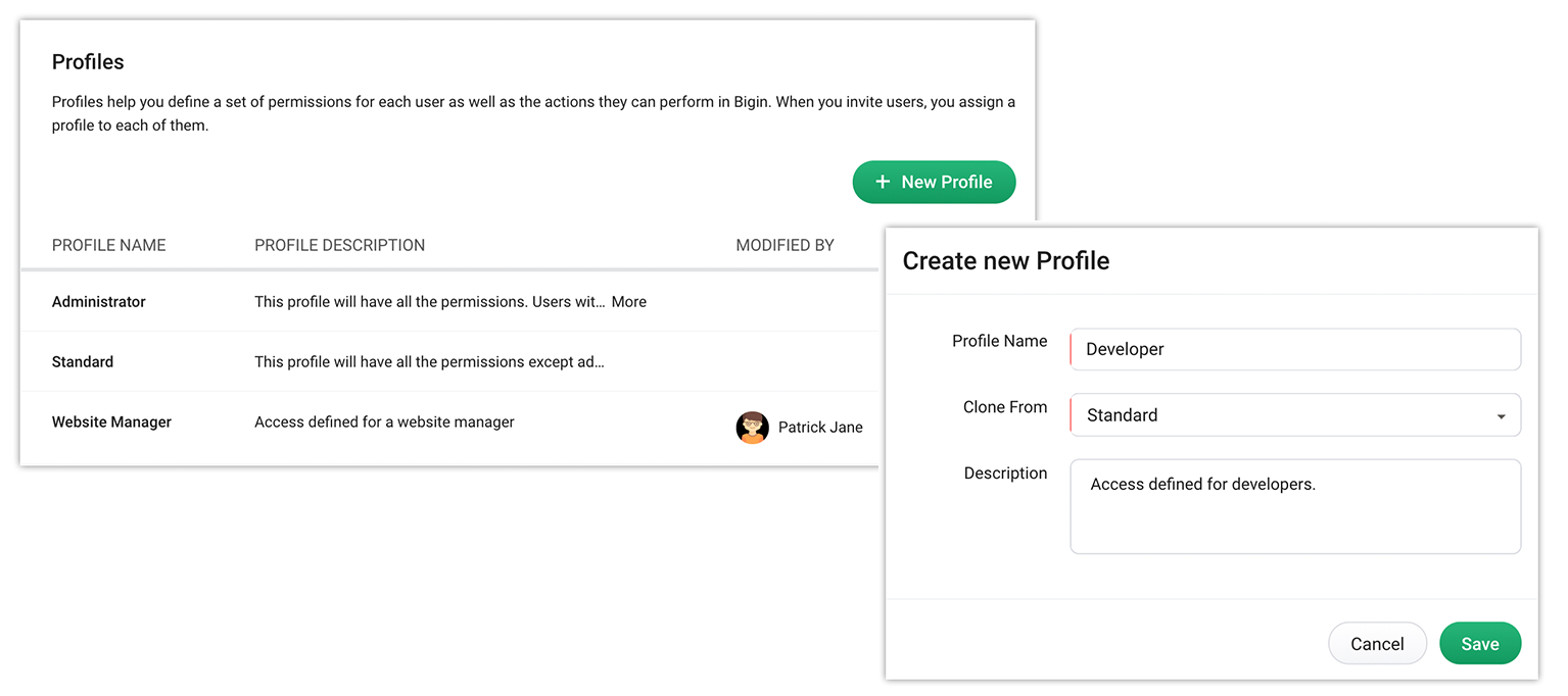 With the help of profiles, you can create a profile for Sales Reps that limits their actions to only the tasks they need to perform. Similarly, you can create a profile for the Sales Managers that will give them access to all the administrative features in Bigin.