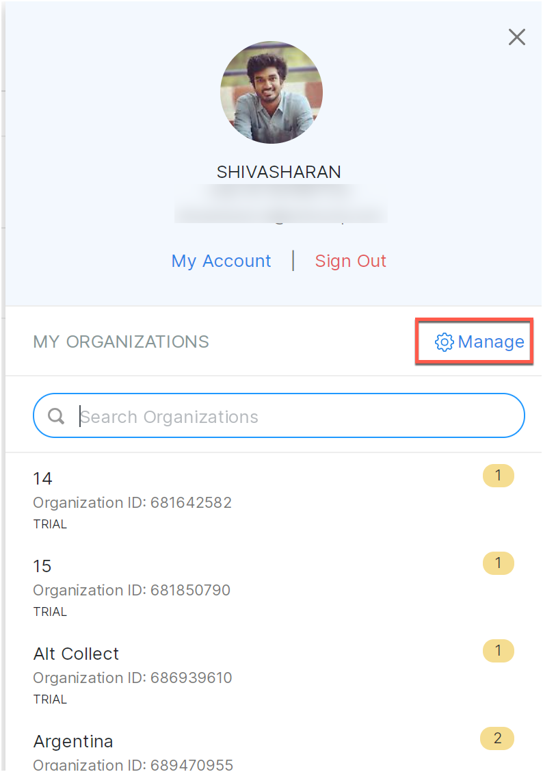 To change your organization, click on your profile in the top-right corner and click Manage next to My Organizations. Select your organization.
